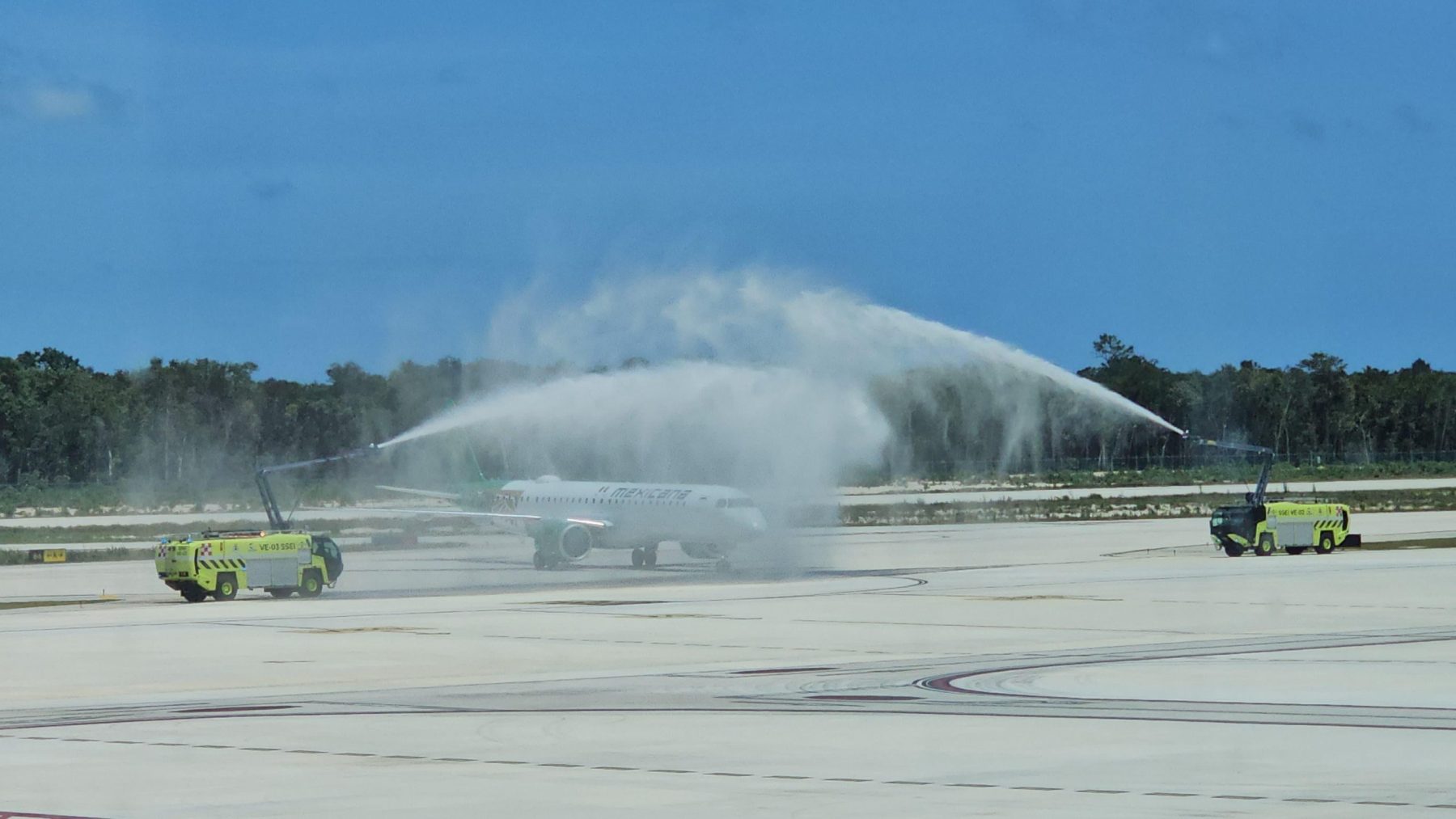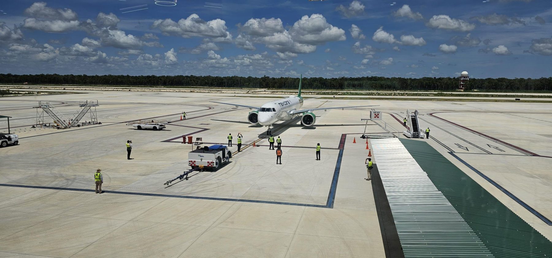 Tulum.- En un hecho que reafirma el dinamismo turístico y la creciente conectividad del Caribe Mexicano, el Aeropuerto Internacional de Tulum “Felipe Carrillo Puerto” recibió uno de los tres nuevos aviones Embraer E195-E2 de la aerolínea Mexicana de Aviación, procedente de la terminal aérea de la “Felipe Ángeles” (AIFA), con una ocupación completa de 132 pasajeros.