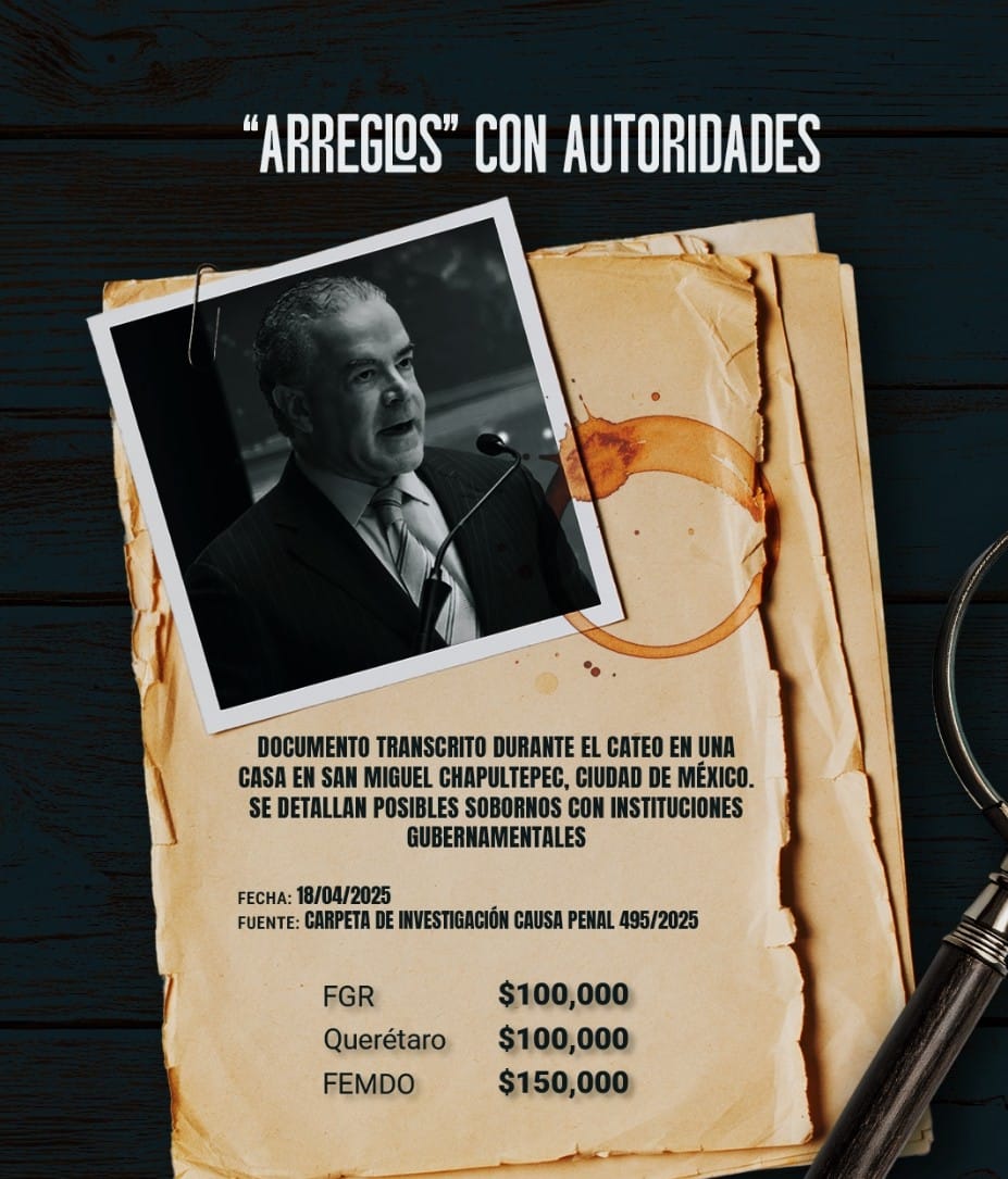 Los agentes también encontraron un hoja donde se describen presuntos sobornos a instituciones como la Fiscalía General de la República (FGR), se trata de “acuerdos” que van de los 100,000 a los 150,000 pesos quincenales.