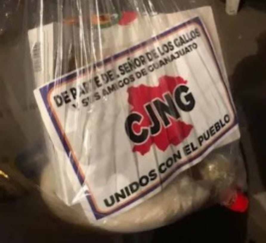 Dada la vulnerabilidad del desastre, el video muestra a residentes del municipio acercándose al grupo de civiles fuertemente armados que distribuyen bolsas de plástico transparente con víveres, enfatizando que son “del Señor de las Palmas y del Cártel Jalisco Nueva Generación”. Las bolsas de víveres también llevan una tarjeta impresa con las siglas CJNG.
