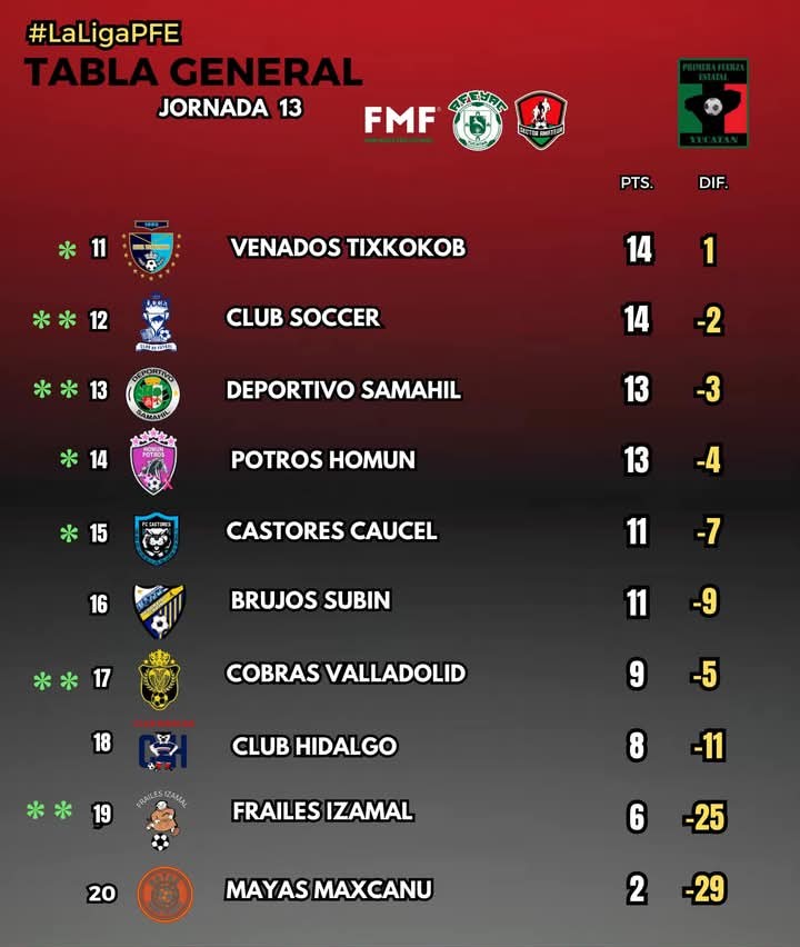 En el tercer escalón se ubica el Deportivo Dzan con 25 puntos, por encima de los Tiburones de Sisal que no tuvieron actividad el pasado fin de semana (23), los Guerreros de Kanasín (22) y el Unión (21), los cuales se encuentran en el cuarto, quinto y sexto peldaño.