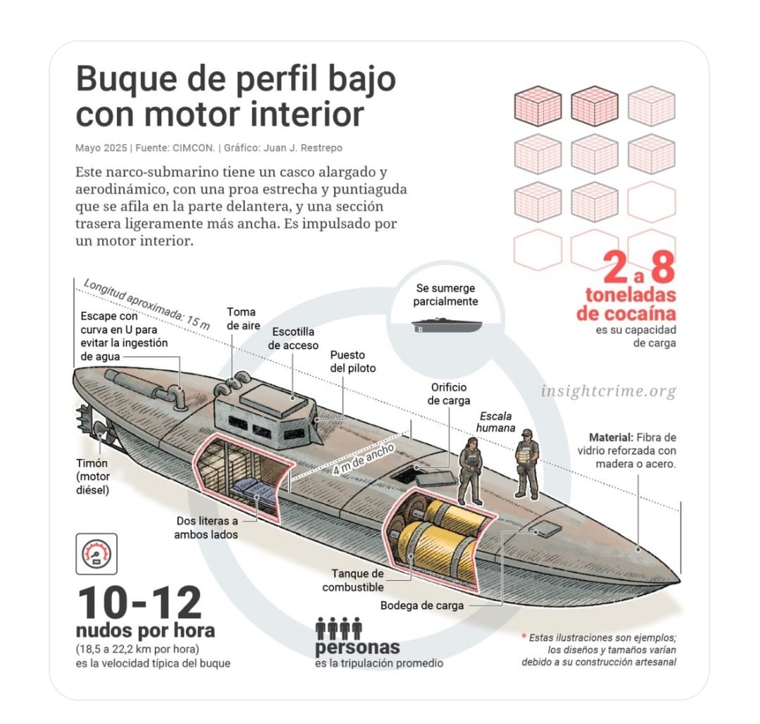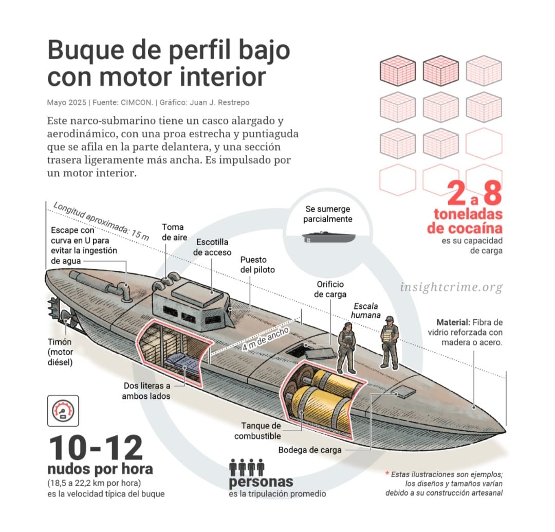 Fabricados de manera artesanal en selvas de Sudamérica, principalmente en Colombia, los semisumergibles están diseñados para evadir radares y patrullas aéreas. Construidos con fibra de vidrio, miden entre 10 y 25 metros de largo, pueden alcanzar velocidades de hasta 27 km/hy tienen capacidad para transportar hasta tres toneladas de cocaína.