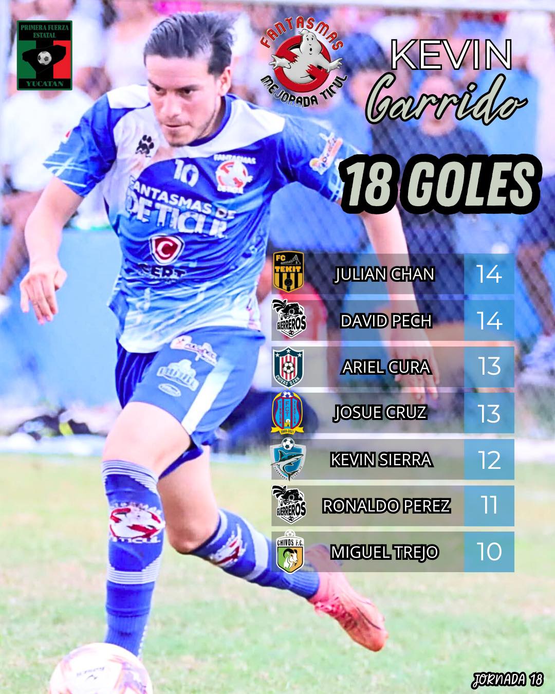 Ahora, por el lado del goleo individual, además de Kevin Garrido, quien se ubica primero con 18 anotaciones, también lo están Julián Chan del Tekit y David Pech de los Guerreros de Kanasín, ambos con 14 tantos, en el segundo y tercer sitio, de manera respectiva.