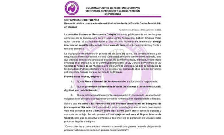 La asociación civil Madres en Resistencia Chiapas dio un plazo de cinco días a la Subdirectora de la Fiscalía Contra Feminicidio, Lizbeth Córdova Vidal, para que presente su renuncia, tras la divulgación de información sensible de un caso sin el consentimiento de la familia afectada.
