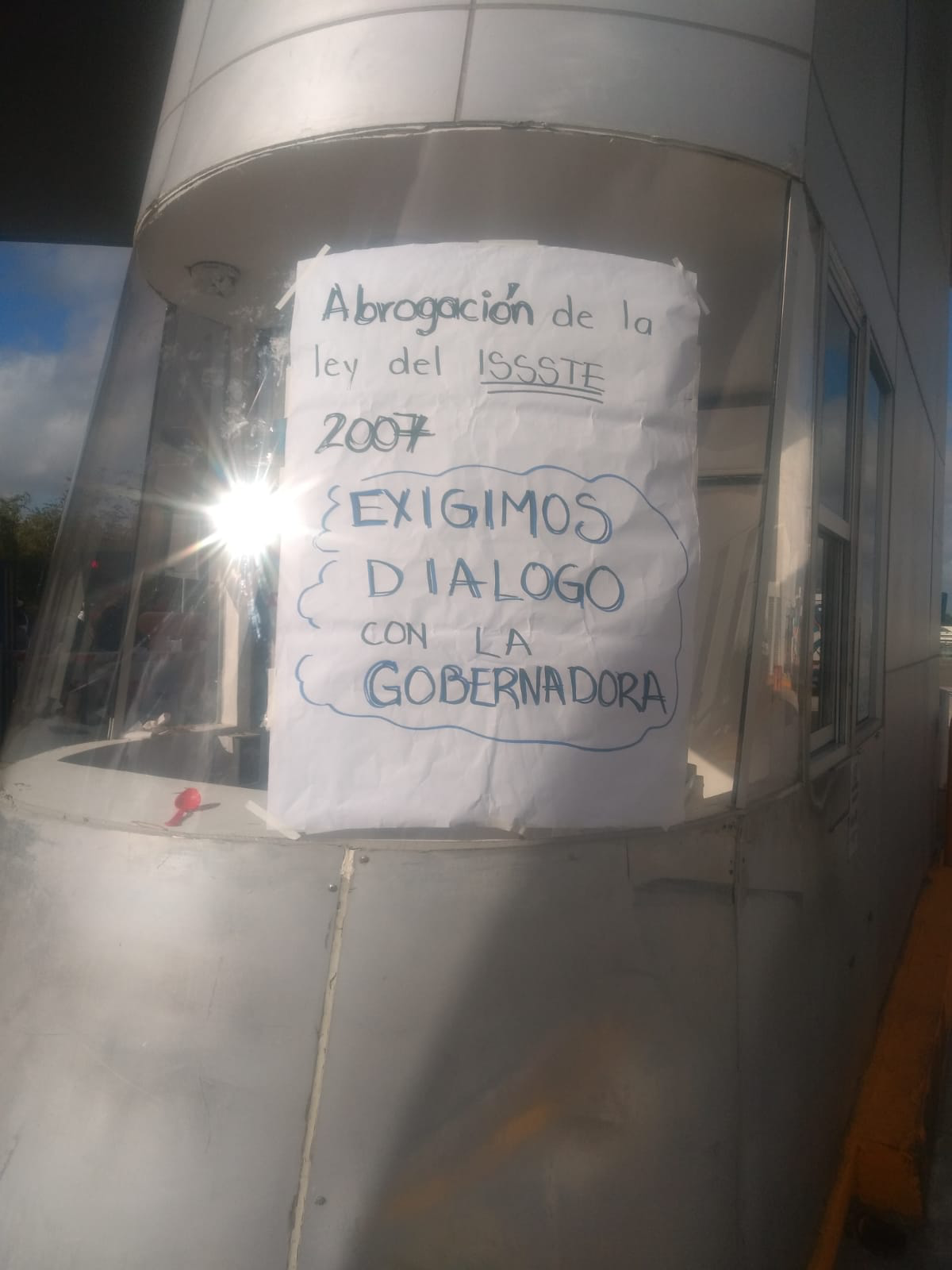 En ellas se podían leer frases como “Rechazamos la Ley del ISSSTE 2025” y “Exigimos un diálogo con la gobernadora”, entre otras consignas más.