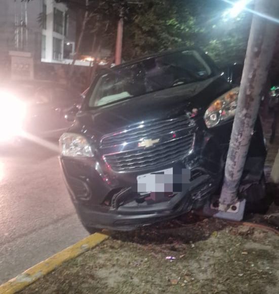 CANCÚN, QRoo, 11 de junio de 2025.- La imprudencia al volante sumó un nuevo incidente a las estadísticas viales de Cancún: un vehículo Chevrolet Trax negro terminó fuera de control tras impactarse contra un poste de alumbrado público en plena zona urbana.