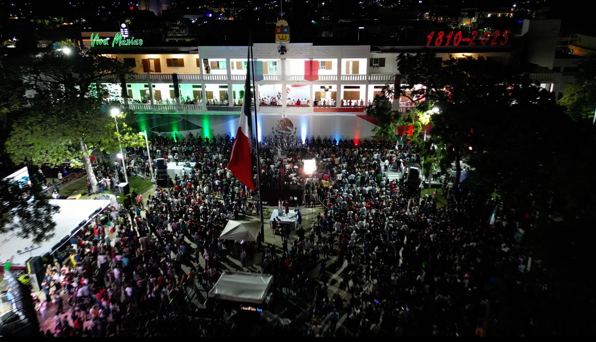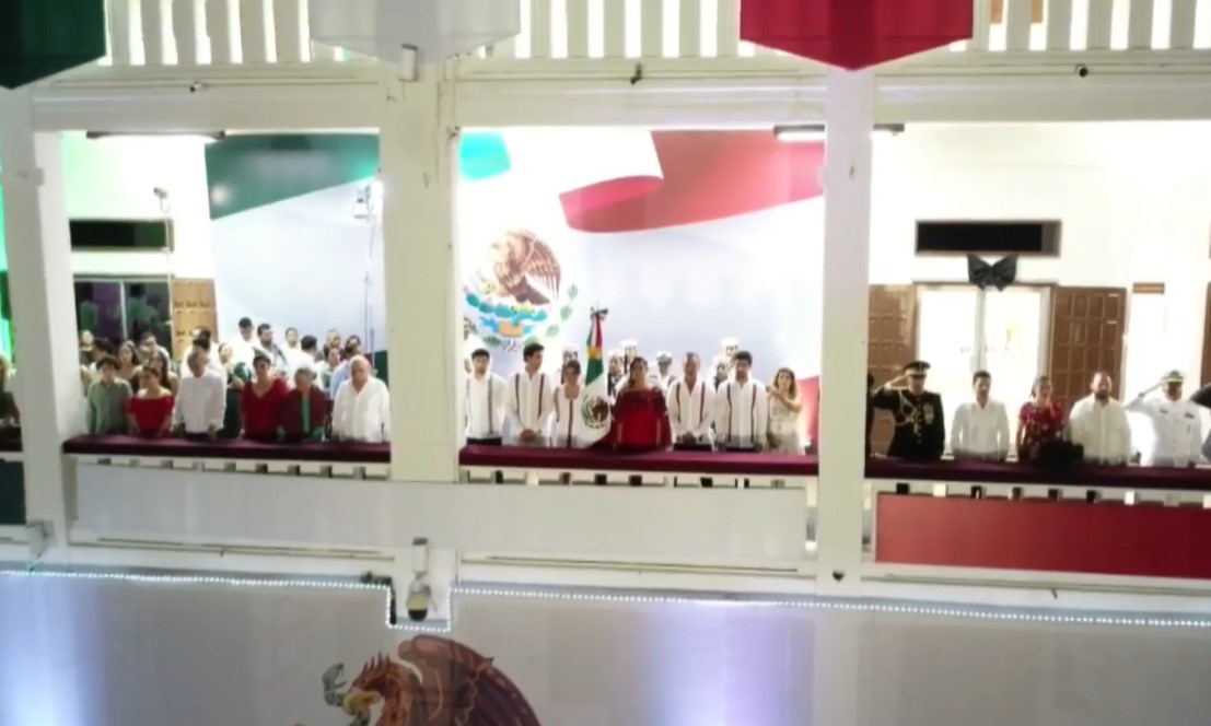 Tras la lectura de los Sentimientos a la Nación, a cargo de la alcaldesa de Othón P. Blanco, la gobernadora tomó la Bandera de México e hizo sonar la campana del Palacio de Gobierno, para emitir el tradicional Grito de Independencia.