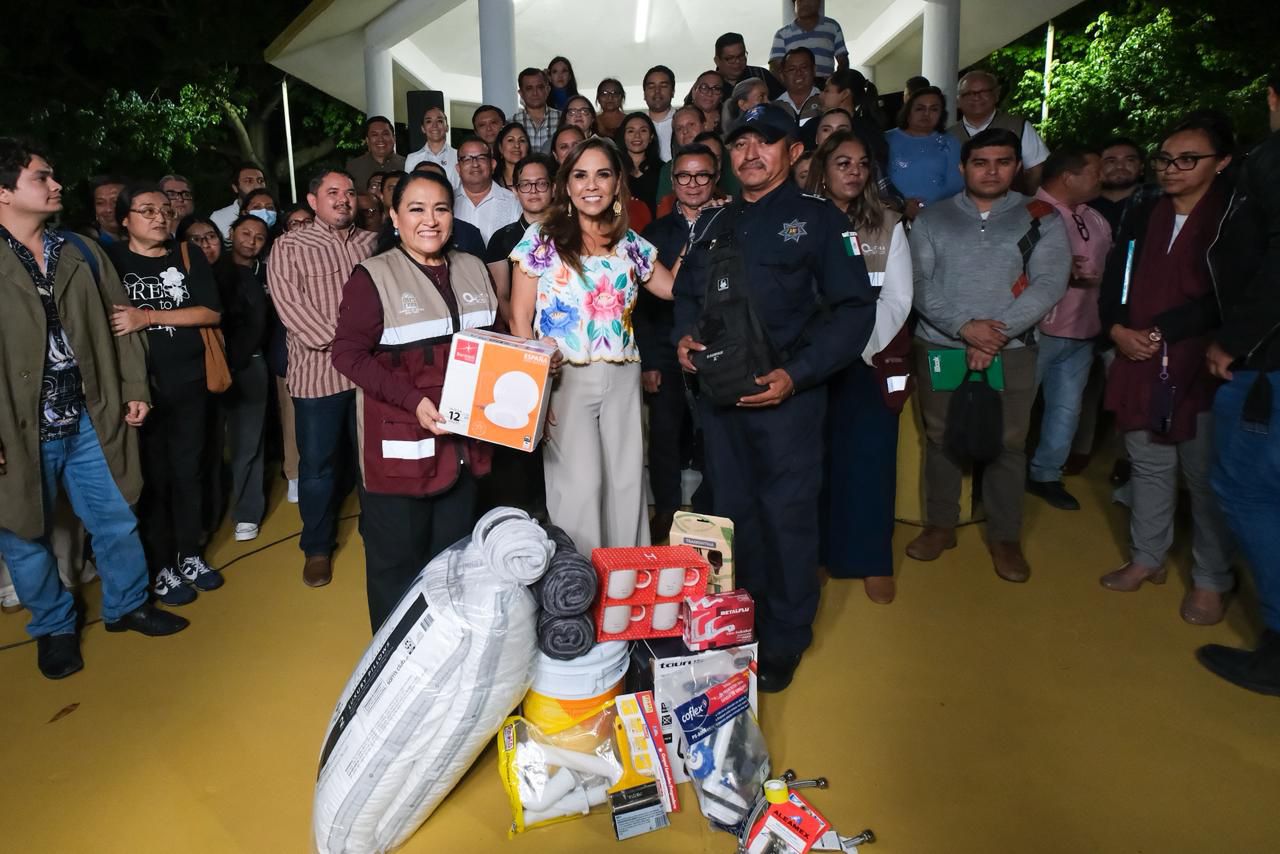 Durante el recorrido, en el que también estuvo Nabil Eljure Terrazas, subsecretario de Gobierno de la SEGOB, la titular del Ejecutivo entregó equipo a los elementos de seguridad ciudadana asignados en la caseta de vigilancia.