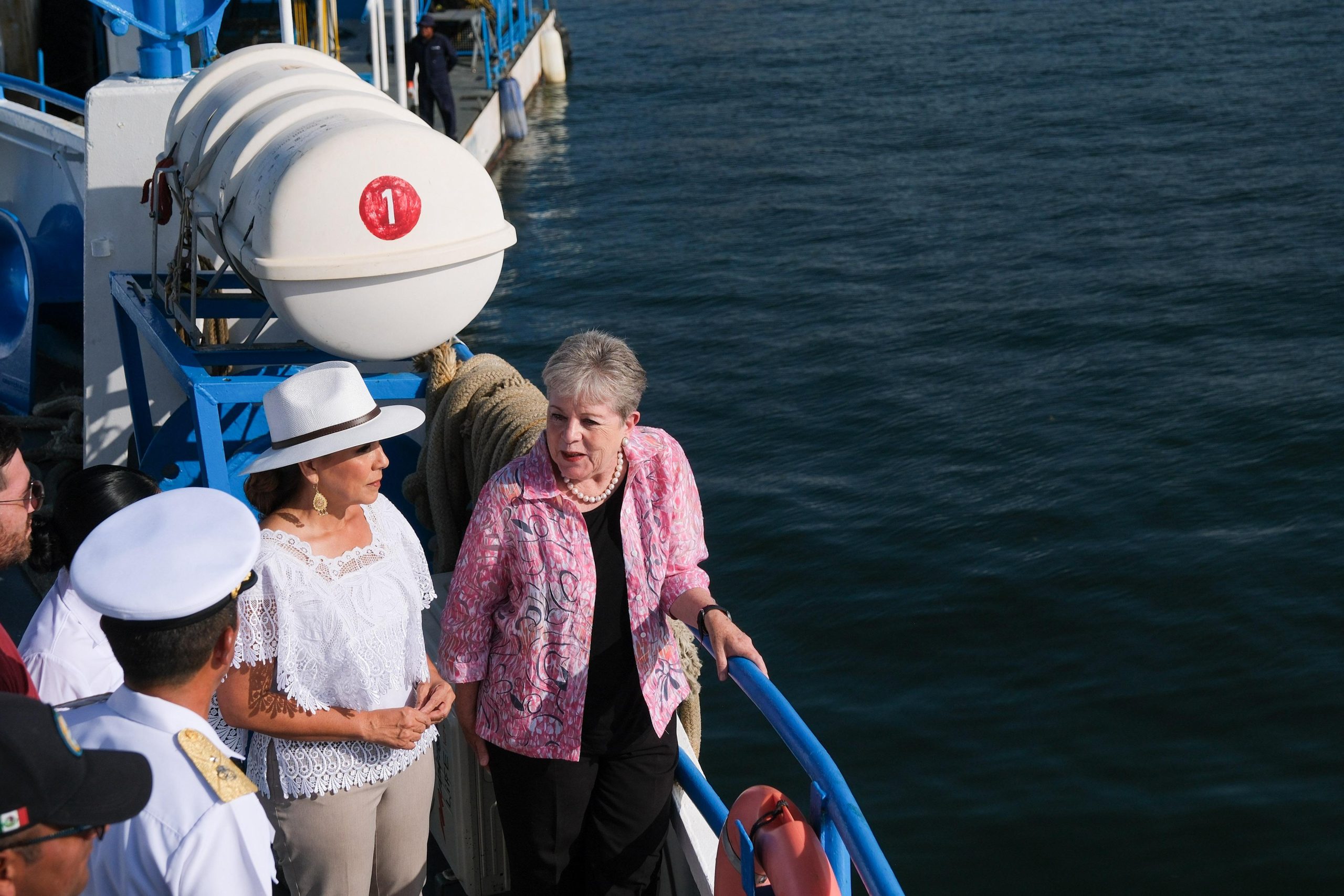 Mara Lezama y Alicia Bárcena Recorren y Supervisan Estrategia Integral Contra el Sargazo a Bordo del Buque “Natans”