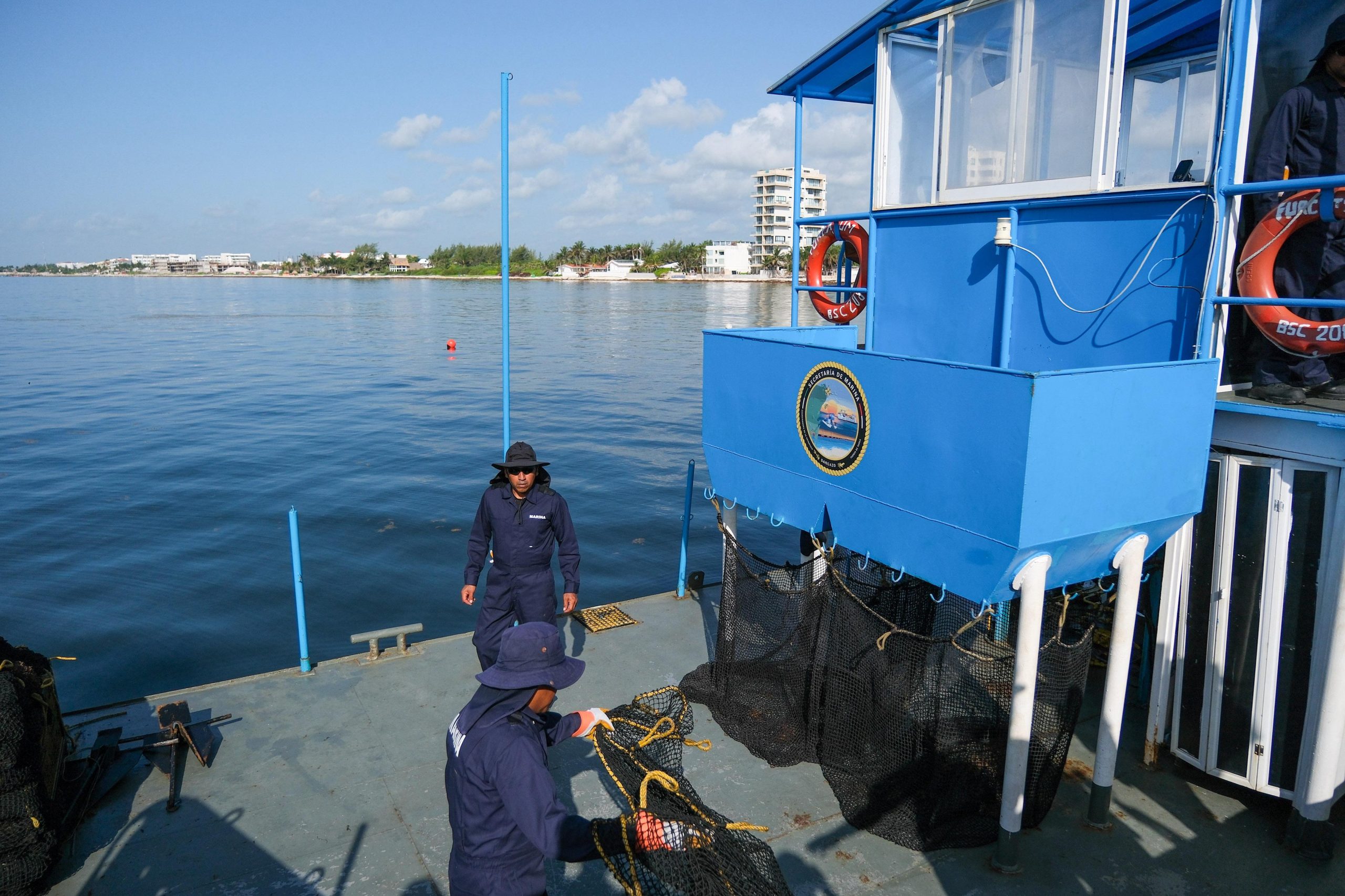 Como parte del mecanismo, se explicó que el sistema de recolección opera por la popa, mediante dos bandas recolectoras, que transportan el sargazo hasta la tolva. El buque es operado por un equipo de 16 elementos de la MARINA, y trabaja en jornadas que van de las siete de la mañana a las nueve de la noche.