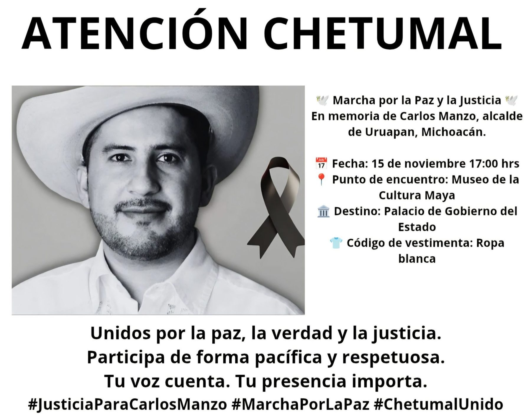 CHETUMAL, 11 de noviembre.- Para el 15 de noviembre está convocada una marcha nacional y en Quintana Roo tras el asesinato del alcalde de Uruapan Carlos Manzo, y a pesar de que se ha asegurado que es un movimiento pacífico y apartidista solo para exigir justicia y paz, la presidenta de Morena en la entidad acusó que es la oposición la que está detrás de la organización y que su único objetivo es demeritar a la 4T.