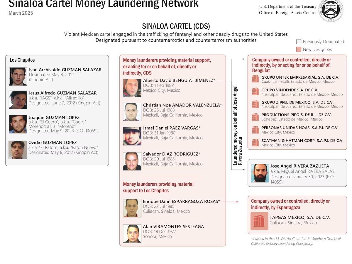 Las sanciones, realizadas por la Oficina de Control de Activos Extranjeros (OFAC) del Departamento del Tesoro, fueron anunciadas el pasado 31 de marzo en contra de seis personas y siete entidades involucradas en una red de lavado de dinero perteneciente al Cártel de Sinaloa, la cual es considerada como una Organización Terrorista Extranjera (FTO, por sus siglas en inglés) por parte de Estados Unidos.