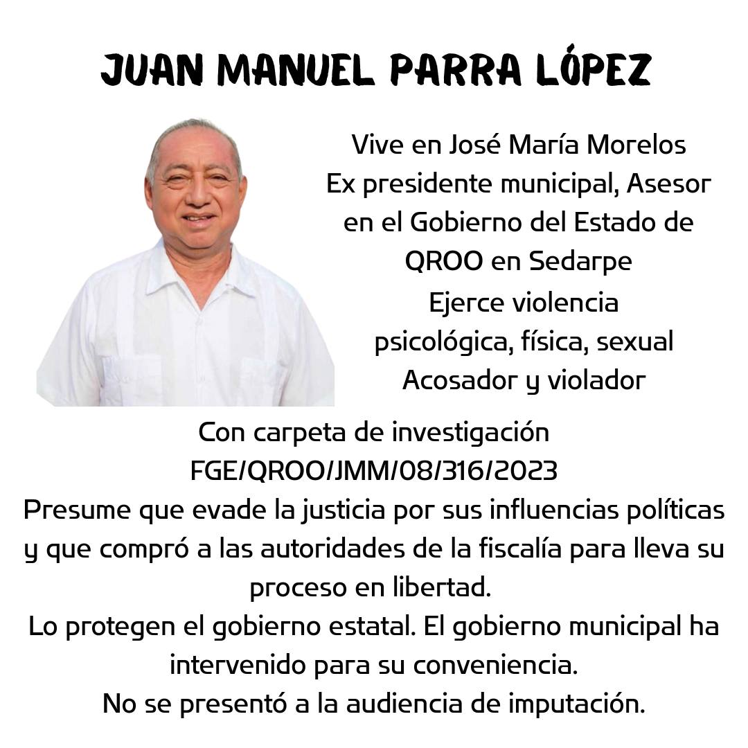 Según la publicación, Parra López es acusado de ejercer violencia psicológica, física y sexual, además de ser señalado como acosador y violador. La información señala que existe una carpeta de investigación en su contra con folio FGE/QROO/JMM/08/316/2023, y se le acusa de evadir la justicia por influencias políticas, supuestamente con la complicidad de autoridades estatales y municipales.
