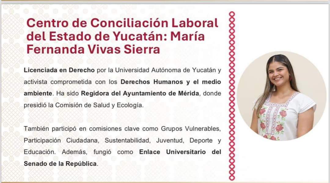 MÉRIDA, YUC.- 06 de noviembre.- Se ha revelado que María Fernanda Vivas Sierra, directora del Centro de Conciliación Laboral del Estado de Yucatán (Cecoley), aparentemente falseó información en su currículum vitae, puesto que indica tener el título de licenciada en derecho cuando no es así. De acuerdo con informes filtrados, Vivas Sierra se presenta como licenciada en derecho por la Universidad Autónoma de Yucatán, aunque no ha cumplido con su servicio social ni posee cédula profesional.