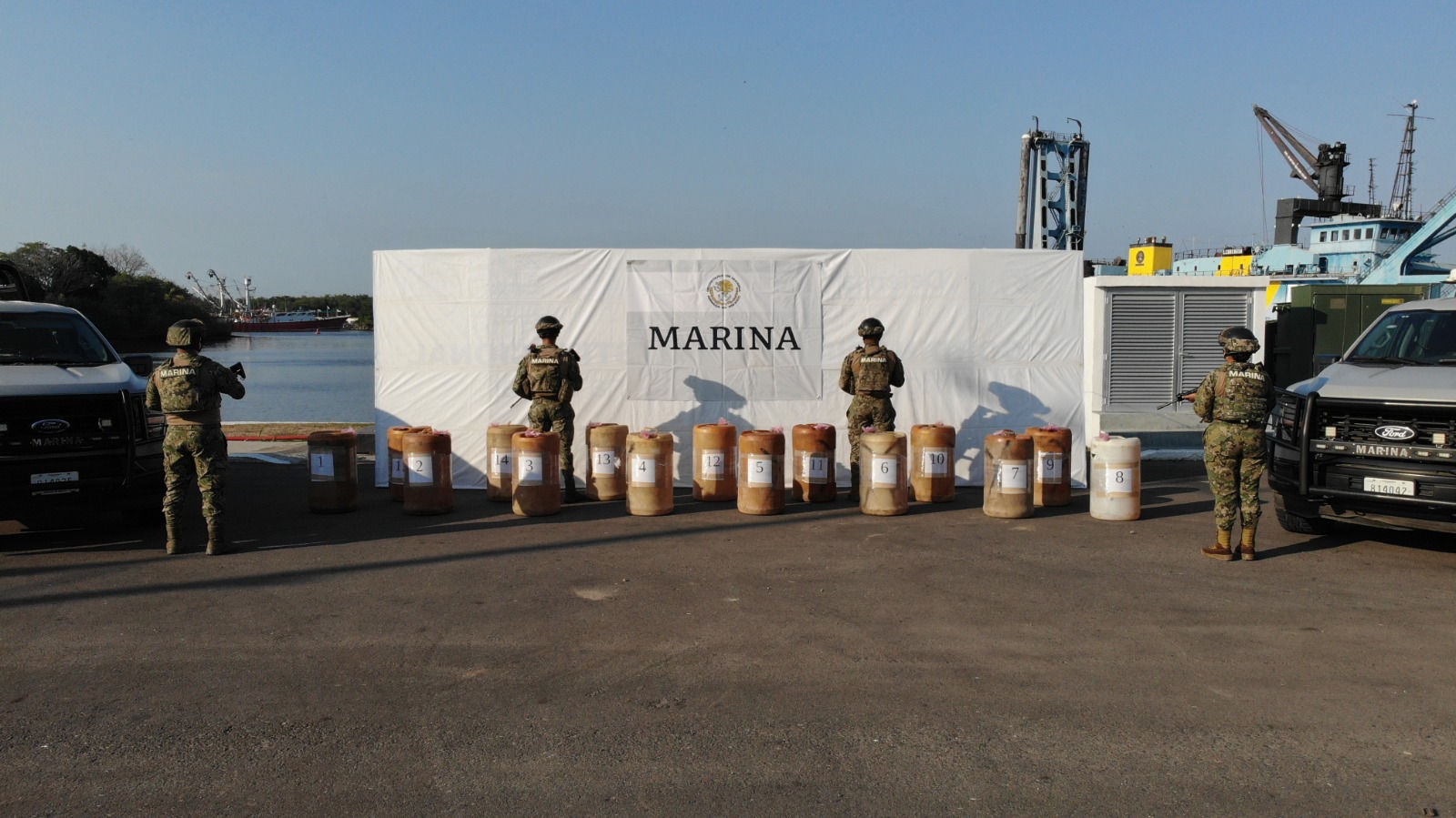 Puerto Chiapas, Chis.– La Secretaría de Marina a través de la Armada de México, por conducto de la Vigésima Segunda Zona Naval, informa que ayer, personal naval localizó y aseguró 15 bidones de plástico con hidrocarburo (diésel), en inmediaciones del municipio de Ciudad Hidalgo, Chiapas.
