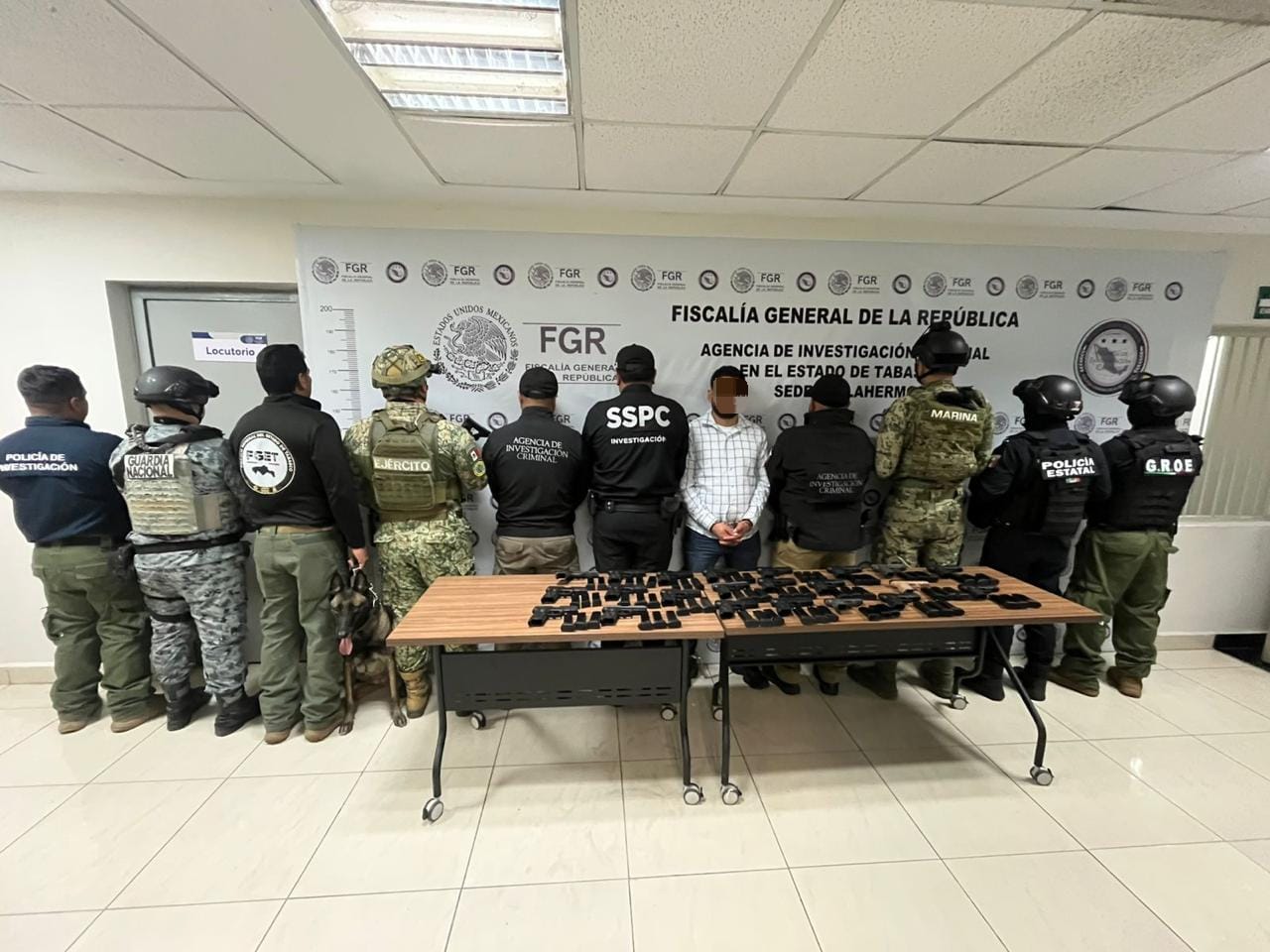 Dos Bocas, Tab.- La Secretaría de Marina a través de la Armada de México, por conducto de la Tercera Región Naval, informa que el día ayer, personal naval en coordinación con autoridades de los tres órdenes de gobierno, se trasladaron a la carretera Las Choapas – Raudales Cozocuautla, en el municipio de Huimanguillo, Tabasco, donde fue detenido un presunto infractor de la ley quien transportaba 22 armas de fuego de diferentes calibres, 65 cargadores, un vehículo y equipo de comunicación.