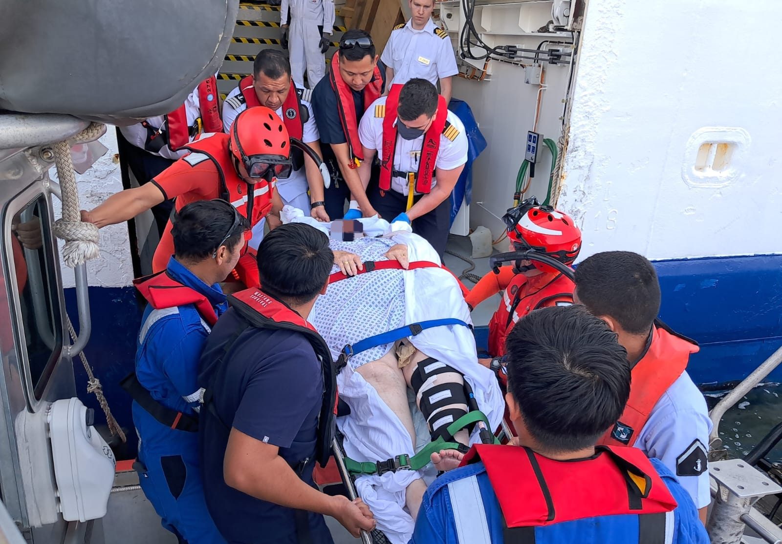 Lo anterior, se llevó a cabo después de recibir una llamada en la que se solicitaba apoyo para desembarcar a una paciente femenina de 76 años de edad de nacionalidad estadounidense, quien presentaba fractura en el fémur de pierna izquierda a consecuencia de una caída; por tal motivo, se ordenó el zarpe inmediato de una embarcación tipo Defender de la ENSAR Lázaro Cárdenas, con personal especializado y de Sanidad Naval a bordo, con el objetivo de salvaguardar la vida humana en la mar.