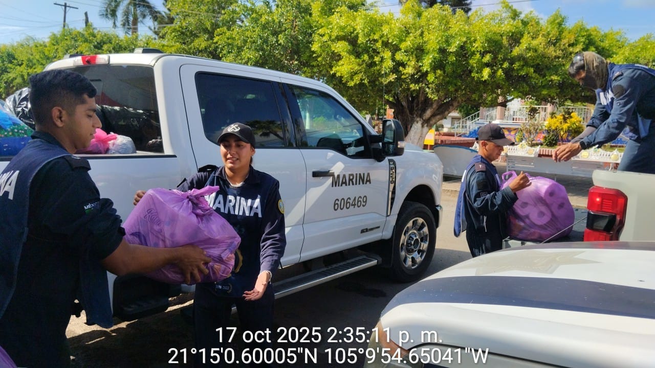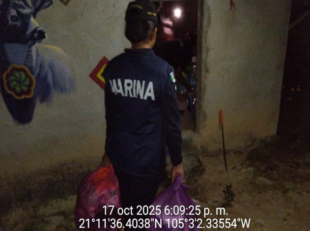 Compostela, Nay., 18 de octubre.- La Secretaría de Marina, a través de la Armada de México, por conducto del Sector Naval de Boca de Chila, informa que, en días pasados, a causa de la tormenta “Raymond”, personal naval en coadyuvancia con otras dependencias, llevó a cabo el apoyo con despensas e hidratación en la comunidad indígena Wixárika en el poblado de Taimarita, municipio de Compostela, Nayarit.