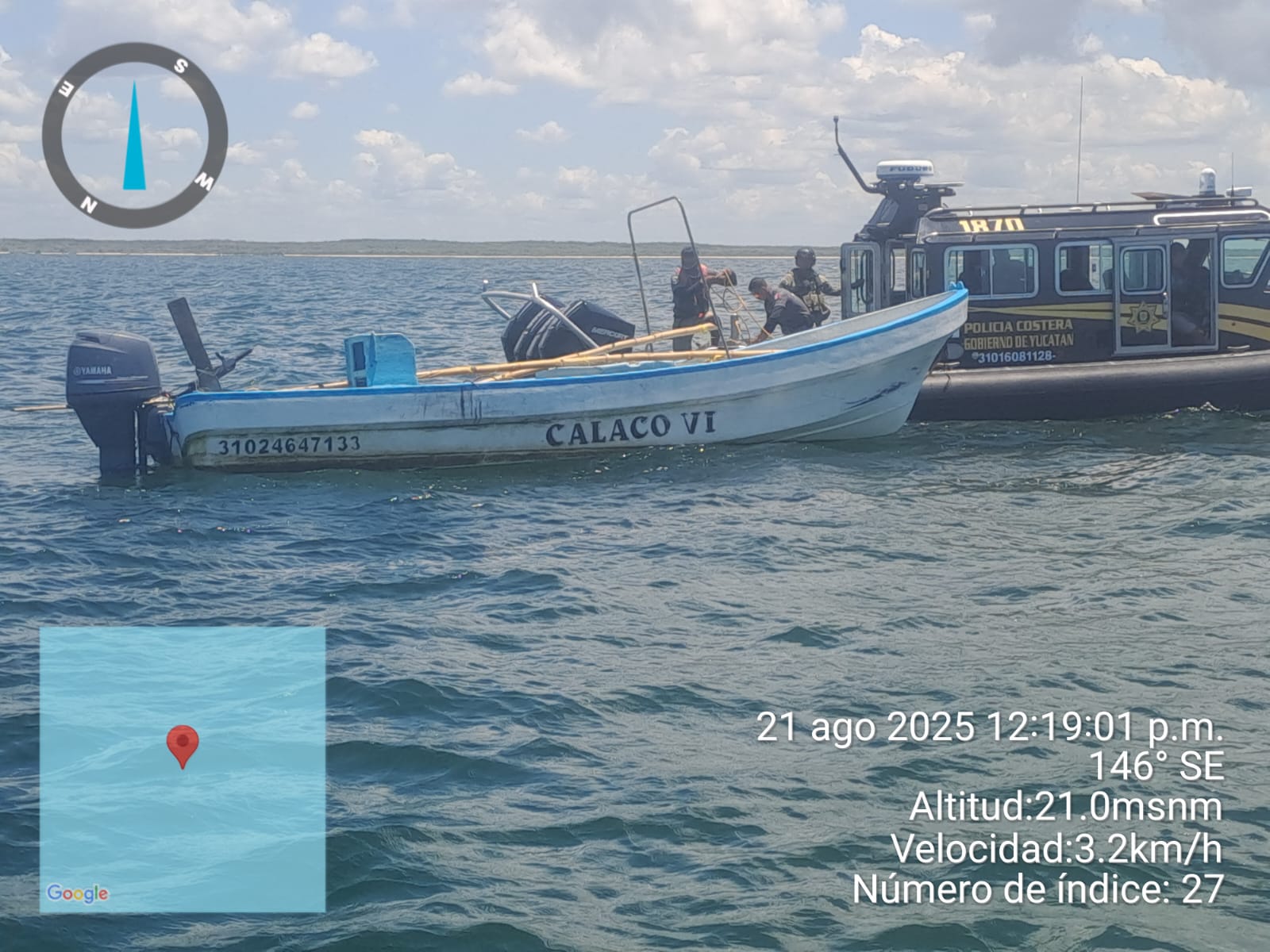 Yucalpetén, Yucatán. – La Secretaría de Marina a través de la Armada de México por conducto de la Novena Zona Naval, informa que ayer, personal naval en coordinación con la Comisión Nacional de Acuacultura y Pesca (CONAPESCA) y de la Secretaría de Seguridad Pública de Yucatán (SSPY), retuvieron una embarcación menor por no contar con los permisos de pesca correspondientes, en las costas de Dzilam de Bravo.