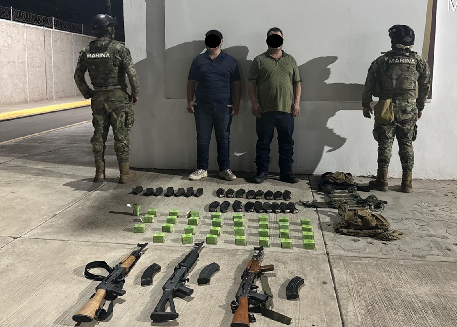 En un segundo evento, en la colonia Stanza Solare, en la Ciudad de Culiacán, se realizó la detención de dos presuntos infractores de la ley, quienes portaban tres armas largas, una motocicleta, un vehículo, 27 cargadores, mil 600 cartuchos calibre 7.62 mm, un bulto con ponchallantas artesanales y equipo táctico diverso.