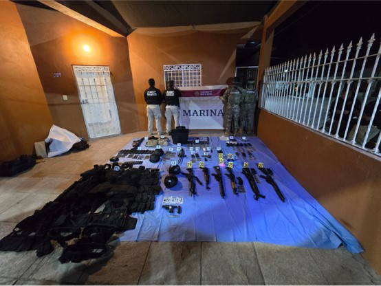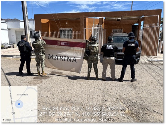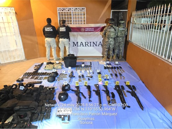 Guaymas, Son.- La Secretaría de Marina, a través de la Armada de México, por conducto de la Segunda Región Naval, informa que ayer, en coadyuvancia con la Agencia Ministerial de Investigación Criminal (AMIC), Policía Estatal de Seguridad Pública y la Secretaría de Seguridad Pública Municipal de Guayas, lograron la detención de nueve personas; presuntos infractores de la ley, así como el aseguramiento de armas y equipo táctico en la colonia Guaymas Norte, municipio de Guaymas, Sonora.