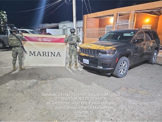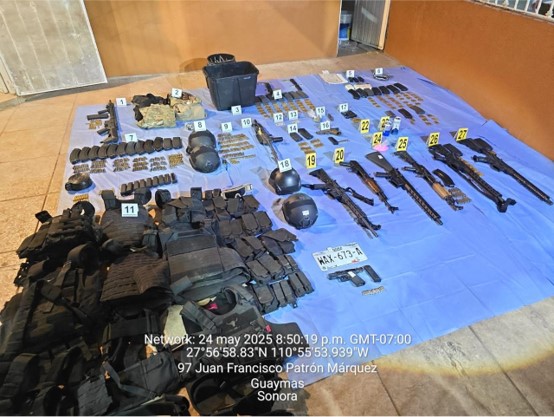 Como resultado de la coordinación interinstitucional, se llevó a cabo esta acción, tras recibir una denuncia ciudadana, logrando con ello, la detención en flagrancia de nueve personas, presuntos infractores de la ley, siete masculinos y dos femeninos, a quienes se les aseguraron siete armas largas de diversos calibres, tres armas cortas, 56 cargadores, 1,090 cartuchos útiles de distintos calibres, 24 dosis de presunta metanfetamina, un envoltorio con característica similares a la marihuana, cuatro cascos balísticos, dos ponchallantas metálicos, diverso equipo táctico y una réplica de arma larga. Así mismo se aseguró un vehículo con reporte de robo del departamento de policía de Los Ángeles, California, EE.UU., mismo que portaba placas sobrepuestas del estado de Sonora.