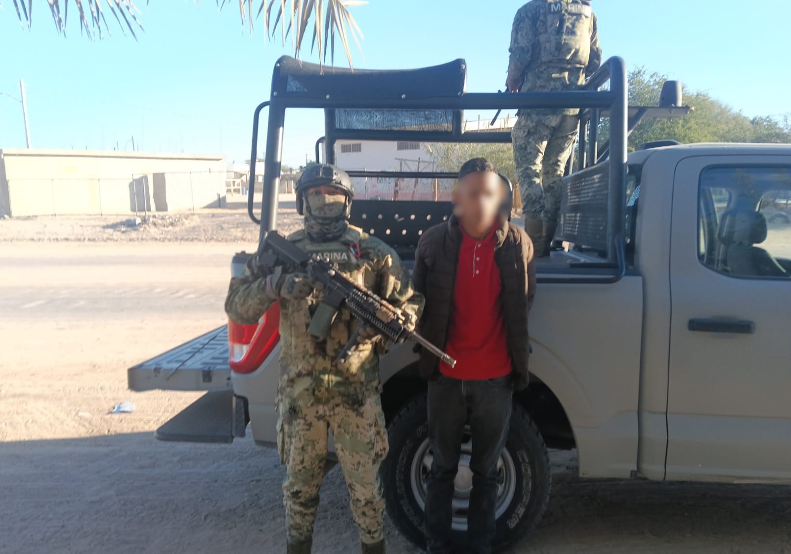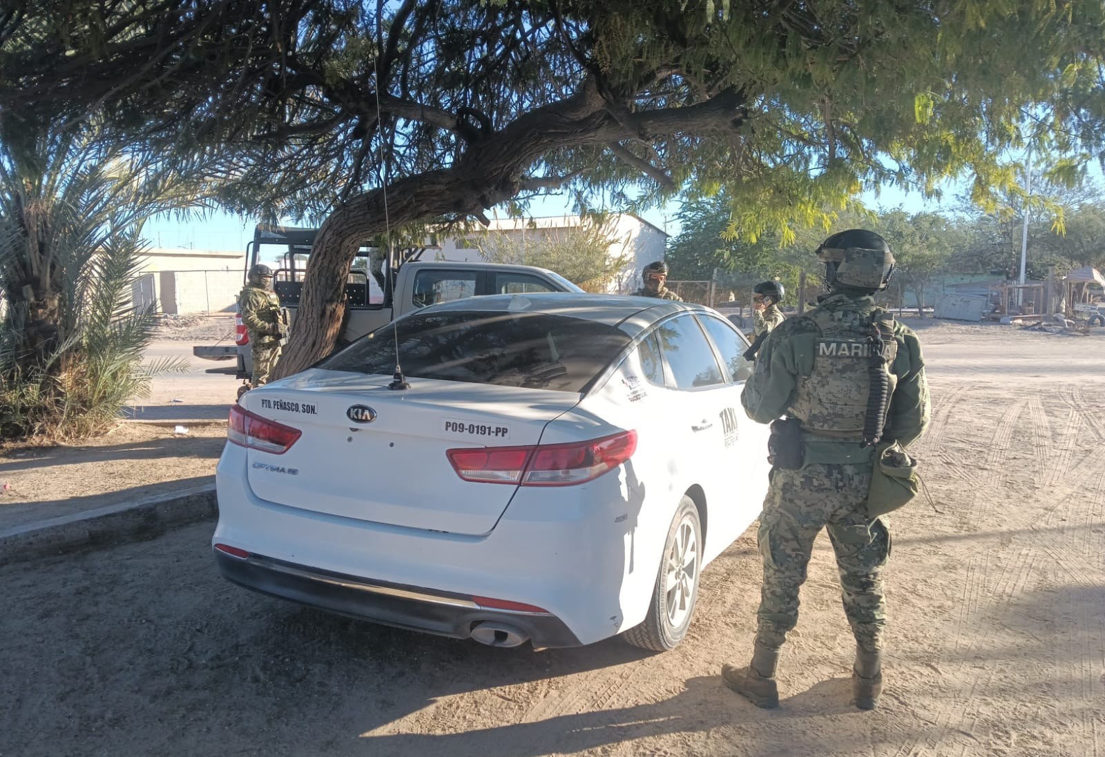 En un segundo recorrido en la Colonia Nuevo Peñasco, se logró la detención de un hombre de nacionalidad extranjera que viajaba a bordo de un vehículo, quién al percatarse de la presencia del personal naval tomó una actitud evasiva, motivo por el cual, citado personal, le indicó detener el vehículo para proceder con la inspección correspondiente, de la cual, se constató que el automóvil tenía reporte de robo en la ciudad de Ensenada, Baja California, mismo que era utilizado como transporte urbano (taxi), lo que motivó la detención del individuo.