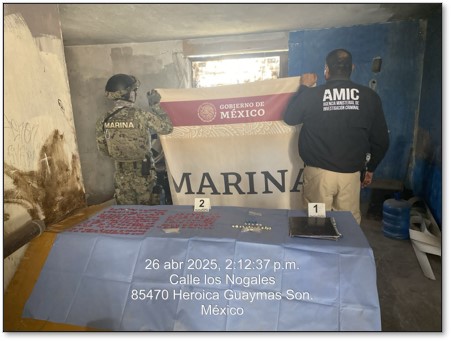 Guaymas, Sonora. – La Secretaría de Marina a través de la Armada de México, informa que del 24 al 27 de abril del actual, en el marco de las acciones para mantener la paz en el Estado de Sonora, personal de la Segunda Región Naval en coordinación con la Agencia Ministerial de Investigación Criminal y Secretarias de Seguridad Pública Municipal, lograron el aseguramiento de diverso material ilícito, durante diferentes recorridos de vigilancia y órdenes de cateo en los municipios de Cajeme y Guaymas, Sonora.