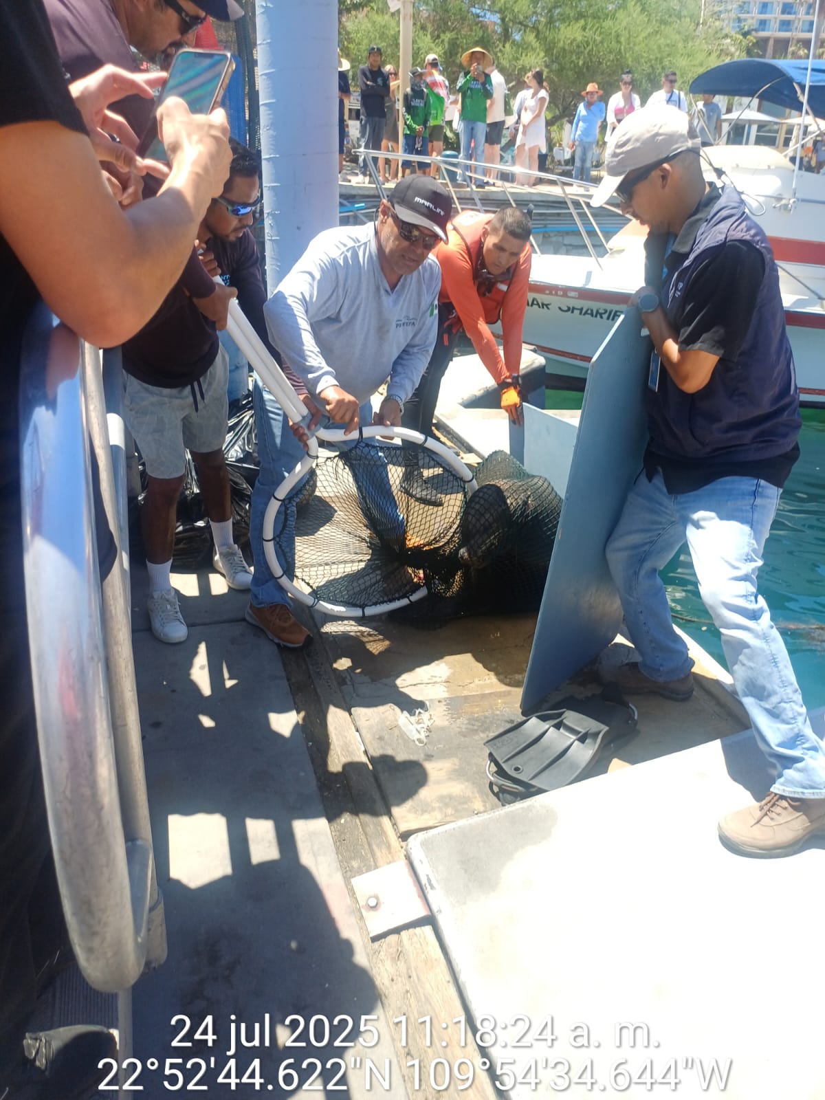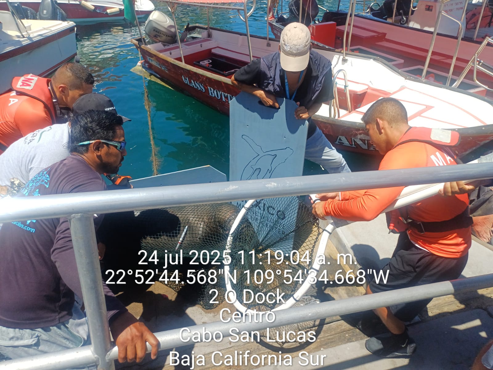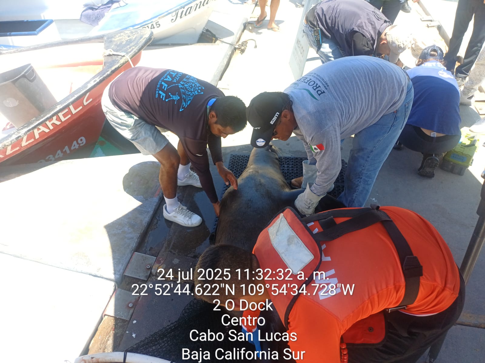 Lo anterior, derivado de un recorrido de patrullaje y vigilancia marítima en inmediaciones del muelle número dos de la marina de Cabo San Lucas, donde personal de la Estación Naval de Búsqueda, Rescate y Vigilancia Marítima (ENSAR) Los Cabos, la Procuraduría Federal de Protección al Ambiente (PROFEPA) y Biólogos Marinos, llevaron a cabo la localización de un lobo marino, el cual tenía señuelos y mallas de pesca enredadas en el cuello, además de presentar heridas en las orejas, procediendo a realizar con éxito maniobras para sedarlo, retirarle citadas artes de pesca, efectuarle curaciones y la aplicación de medicamentos, para posteriormente liberarlo en su hábitat natural.