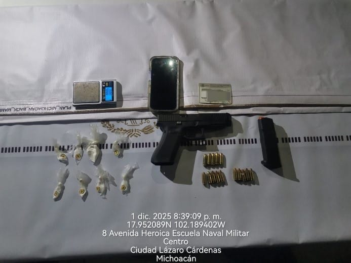 Lázaro Cárdenas Mich.– La Secretaría de Marina, a través de la Armada de México, por conducto de la Décima Sexta Zona Naval, en coadyuvancia con la Guardia Civil, como parte del Plan Michoacán por la Paz y la Justicia, informa que ayer se realizó la detención de un presunto transgresor de la ley, así como el aseguramiento de un arma corta, un cargador, cartuchos, ocho bolsas con sustancia blanca con características similares a las de la cocaína, además de un vehículo y equipo de comunicación, en esta ciudad y puerto.
