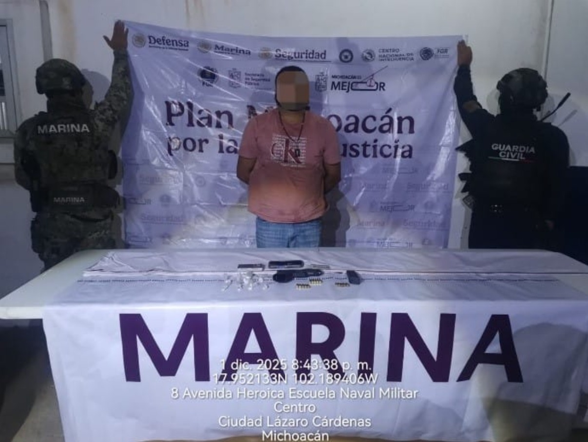 Lázaro Cárdenas Mich.– La Secretaría de Marina, a través de la Armada de México, por conducto de la Décima Sexta Zona Naval, en coadyuvancia con la Guardia Civil, como parte del Plan Michoacán por la Paz y la Justicia, informa que ayer se realizó la detención de un presunto transgresor de la ley, así como el aseguramiento de un arma corta, un cargador, cartuchos, ocho bolsas con sustancia blanca con características similares a las de la cocaína, además de un vehículo y equipo de comunicación, en esta ciudad y puerto.