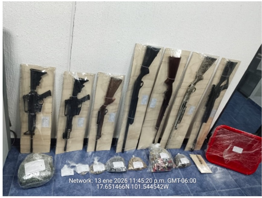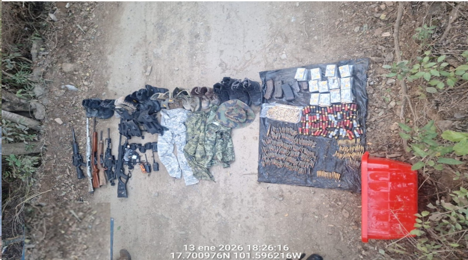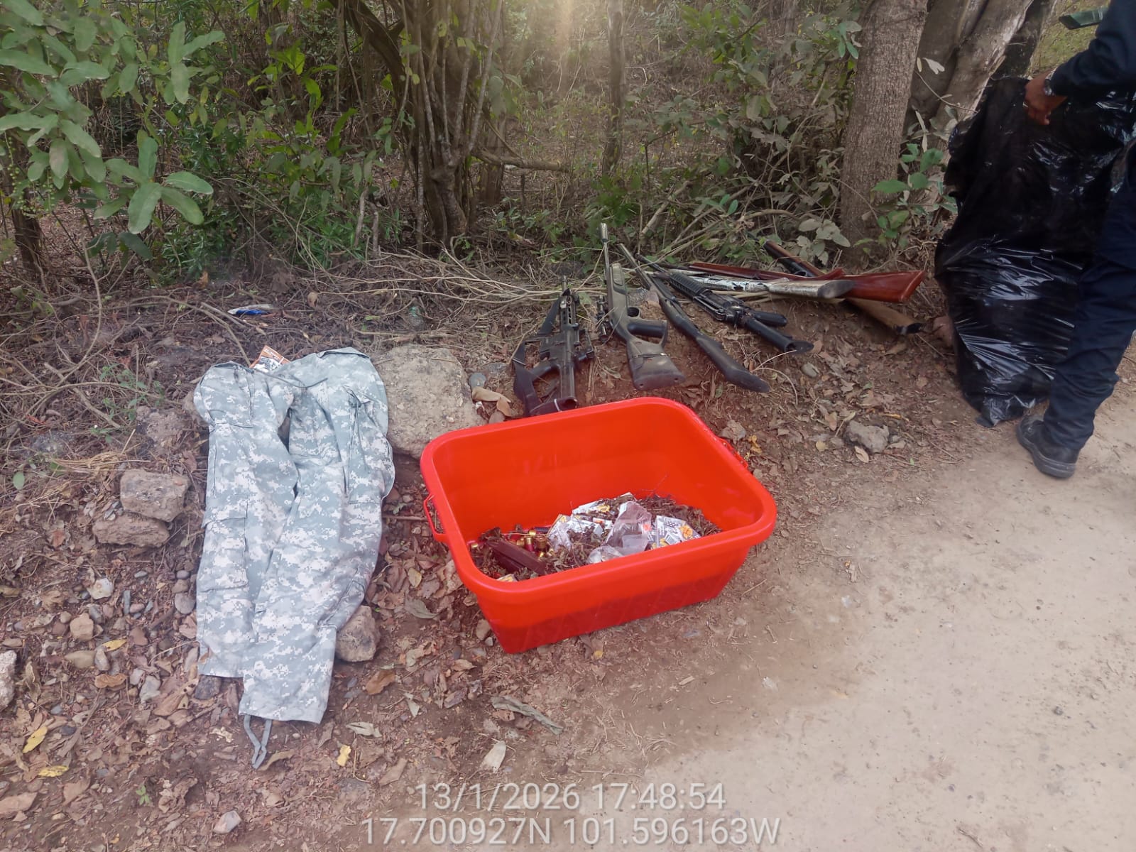 Lo anterior se llevó a cabo como resultado de la coordinación interinstitucional durante recorridos de patrullaje terrestre y de vigilancia, donde se logró el aseguramiento de equipo táctico como: dos pantalones, un sombrero, y una camisola, de igual manera se aseguró el siguiente armamento: dos escopetas, cinco rifles, cinco cargadores y 773 cartuchos útiles de diferentes calibres.