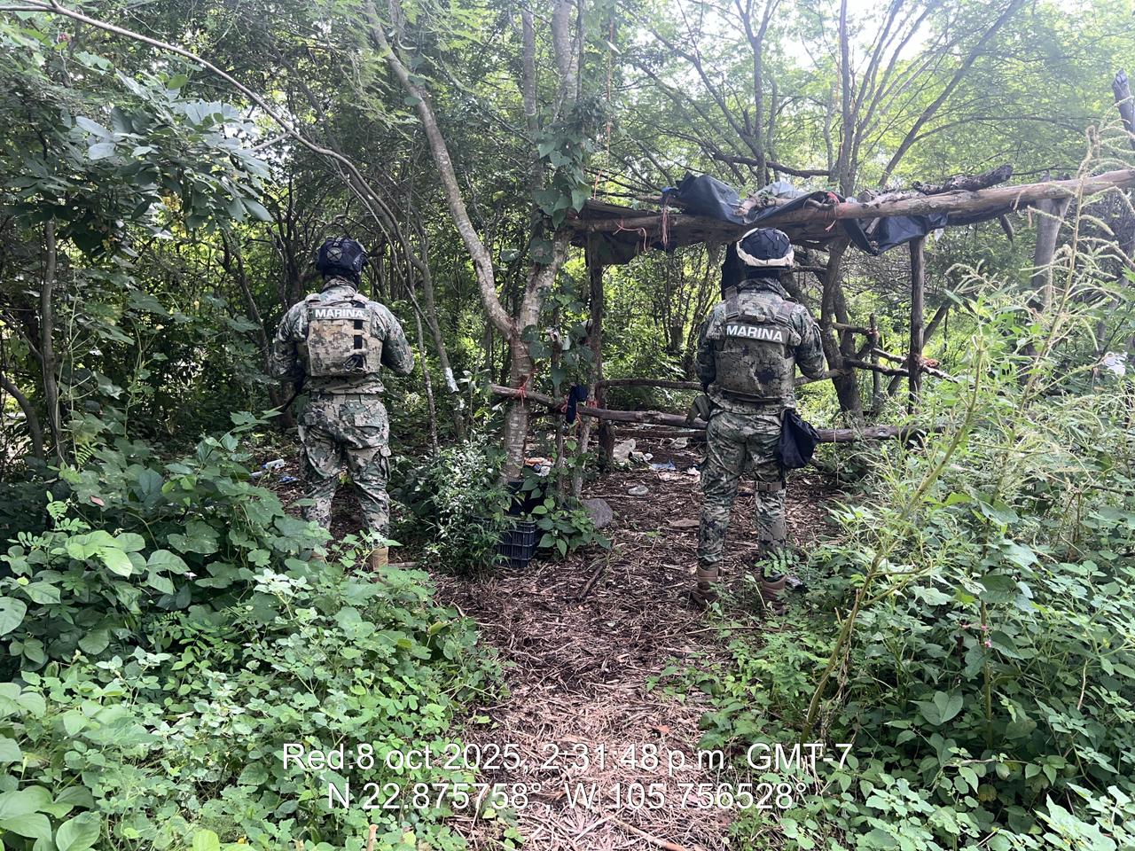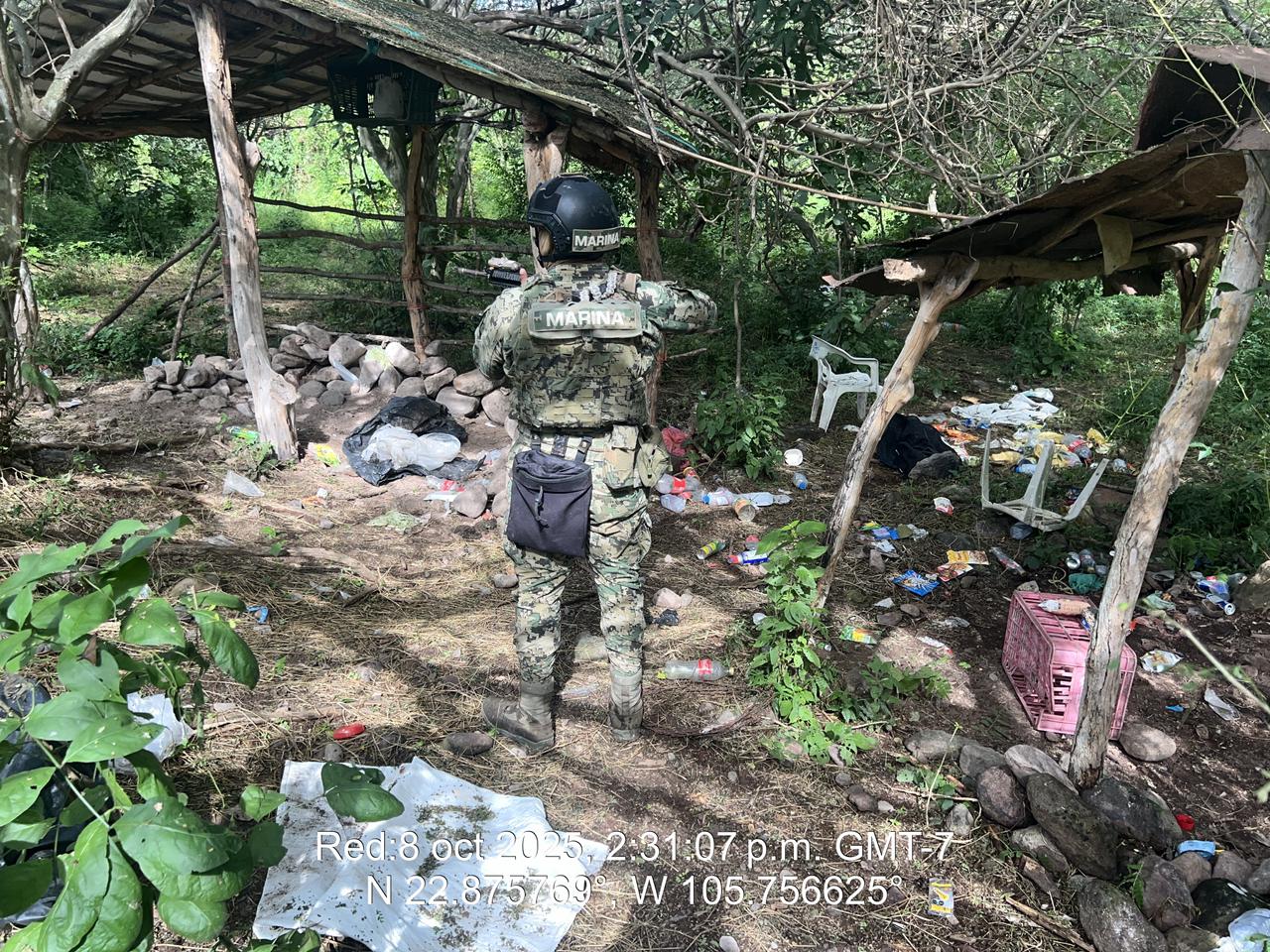 La Secretaría de Marina, a través de la Armada de México, informa que ayer personal de la Cuarta Región Naval, en coadyuvancia con la Secretaría de la Defensa Nacional (Defensa), Guardia Nacional (GN), Fiscalía General de la República (FGR) y Fiscalía General del Estado (FGE), localizaron tres campamentos improvisados presuntamente por integrantes de la delincuencia organizada, un artefacto explosivo improvisado y un vehículo en Escuinapa, Sinaloa.