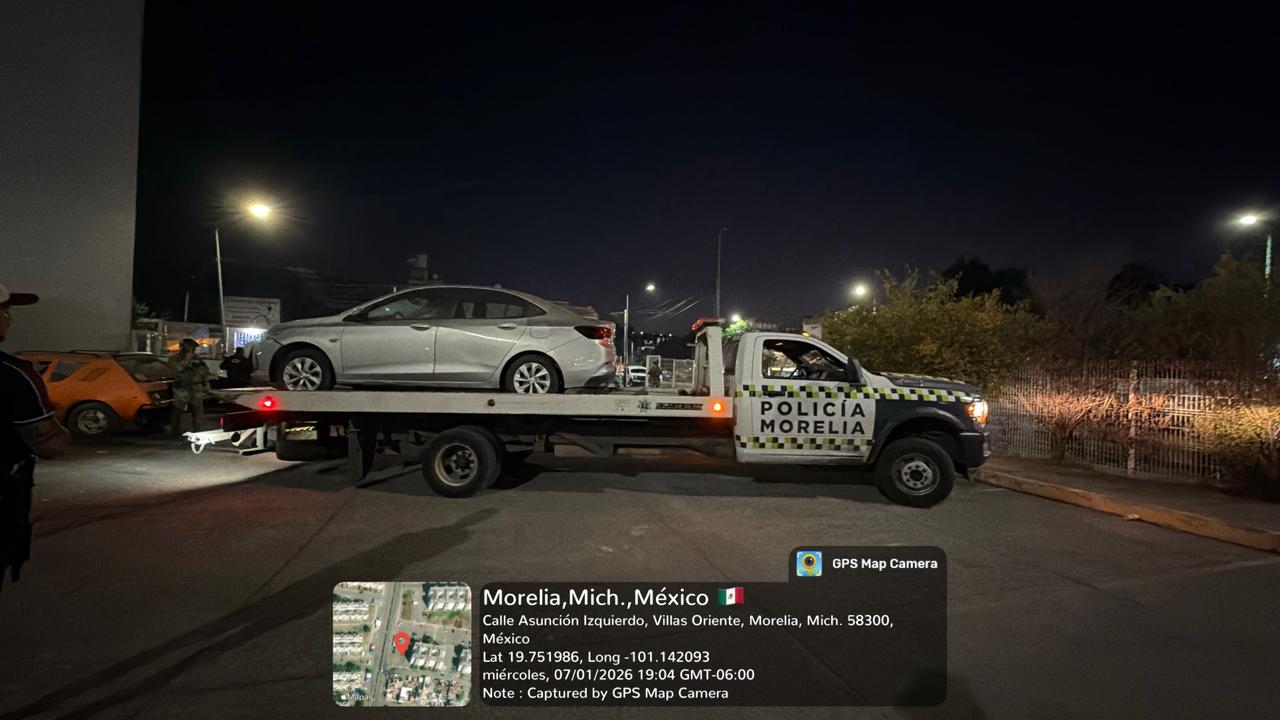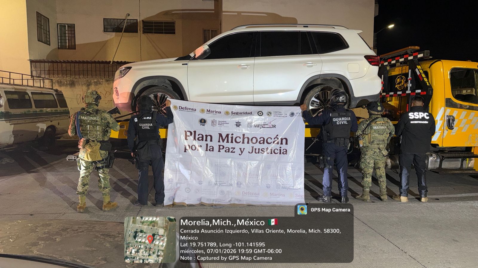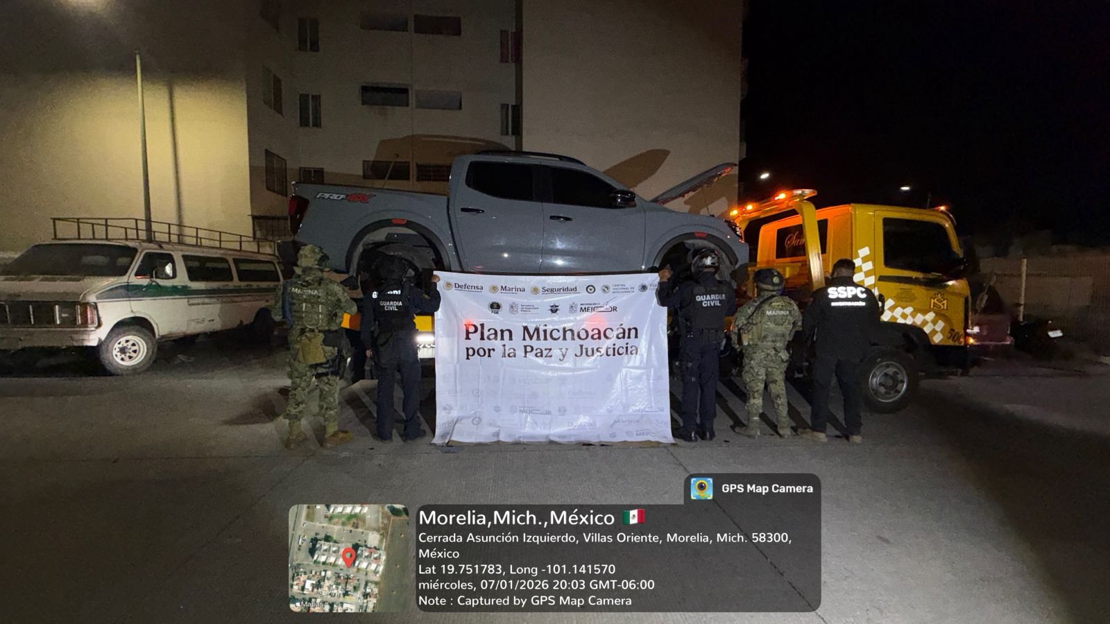 La primera acción se llevó a cabo cuando personla naval, al estar realizando recorridos en inmediaciones del Fracccionammiento Villas del Oriente, en Morelia, Michoacán, lograron el aseguramiento de cuatro vehículos con alteración en sus medios de identificación, mismos que presentaban reporte de robo.