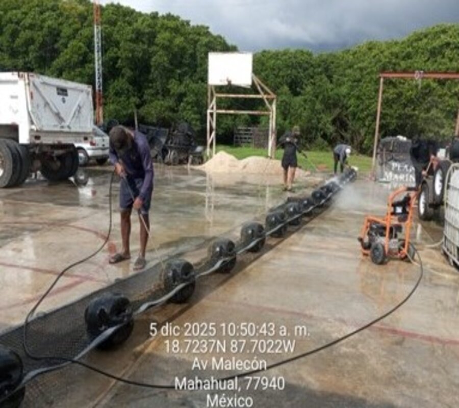 Bajo este contexto, del 29 de noviembre al 5 de diciembre, se efectuó el mantenimiento de 12 tramos de barreras contenedoras de sargazo de aproximadamente 150 metros en las playas de Mahahual y Xcalak, labor que fue realizada por 77 elementos de este Mando Naval y 80 de personal civil entre empresarios, restauranteros y prestadores de servicio del Puerto de Mahahual.