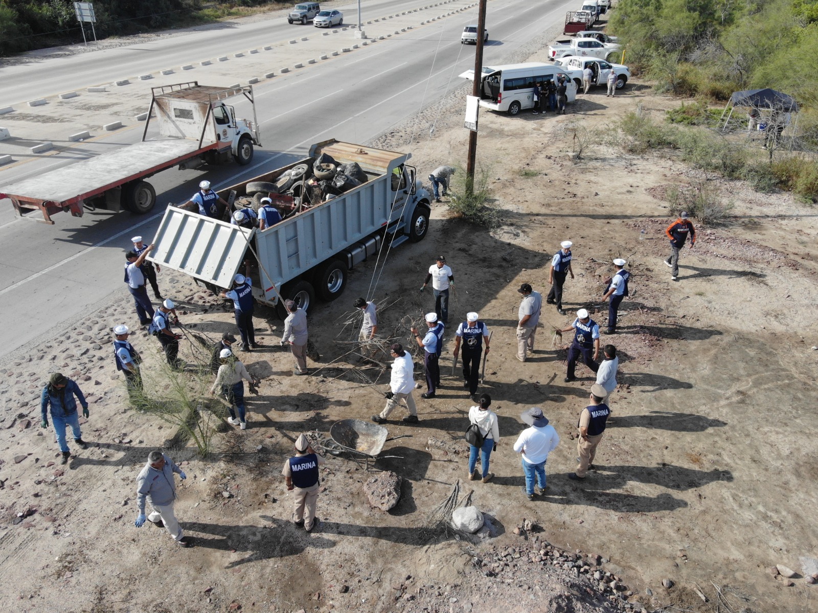 Esta actividad se realizó mediante un trabajo conjunto entre 19 elementos navales de diferentes unidades y establecimientos de la Cuarta Zona Naval y 57 civiles pertenecientes a distintas dependencias gubernamentales, entre los que se encuentra personal de la Zona Federal Marítimo Terrestre (ZOFEMAT), la Secretaría de Medio Ambiente y Recursos Naturales (SEMARNAT) y la Dirección General de Sustentabilidad y Manejo de Residuos del Ayuntamiento de La Paz; asimismo, se contó con la participación de la iniciativa privada a través de la empresa Baja Ferries S.A. de C.V., estudiantes de la Universidad Autónoma de Baja California Sur y organizaciones de la sociedad civil como Efecto Arena A.C. y Playa Saltito A.C.