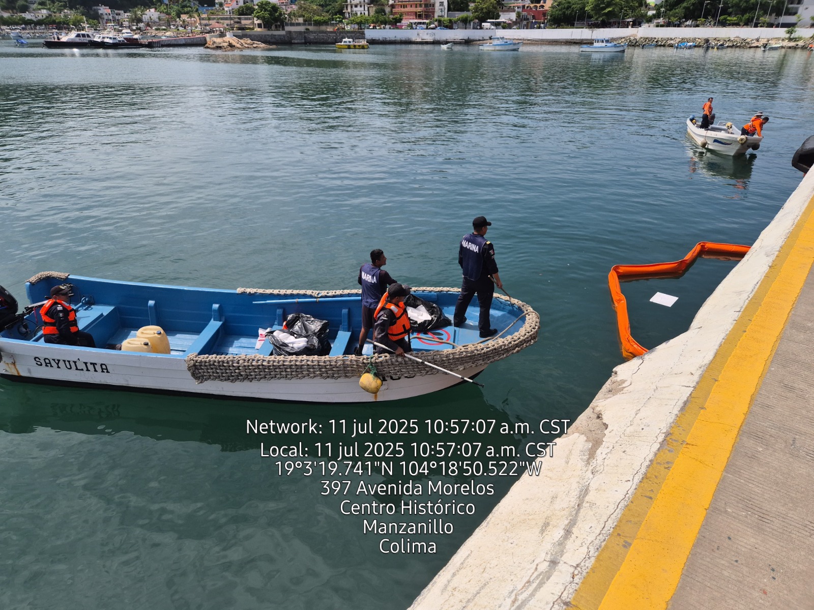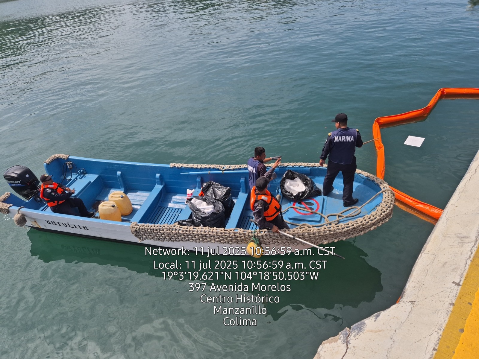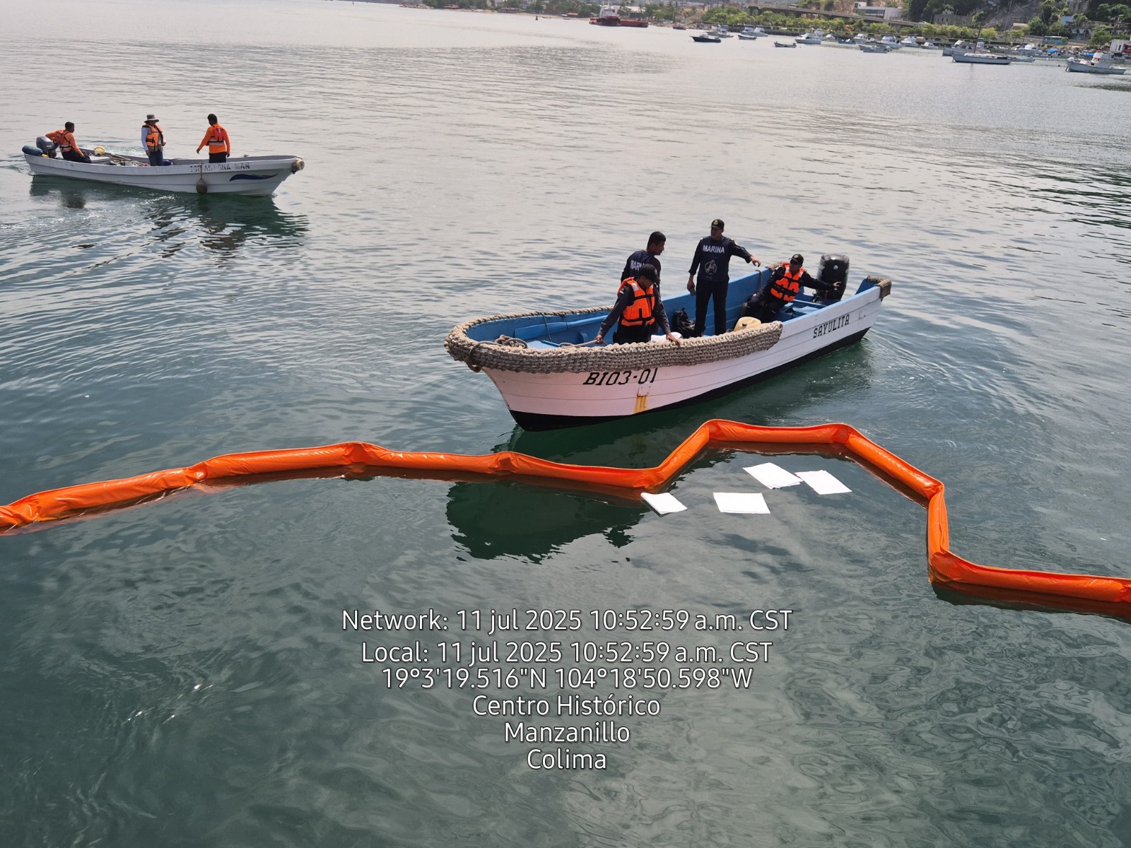 En esta ocasión, la participación de la Secretaría de Marina en esta práctica fue a través del personal de Protección al Medio Ambiente Marino (PROMAM), quienes acudieron al lugar del incidente al momento de recibir la orden de la Sala de Mando y Control de este Mando Naval, a quienes la ASIPONA Manzanillo solicitó el apoyo. El personal de PROMAM arribó a bordo de una embarcación menor, transportando 30 metros de barrera oleofílica y cinco kilos de toallas absorbentes, para retirar el hidrocarburo derramado.