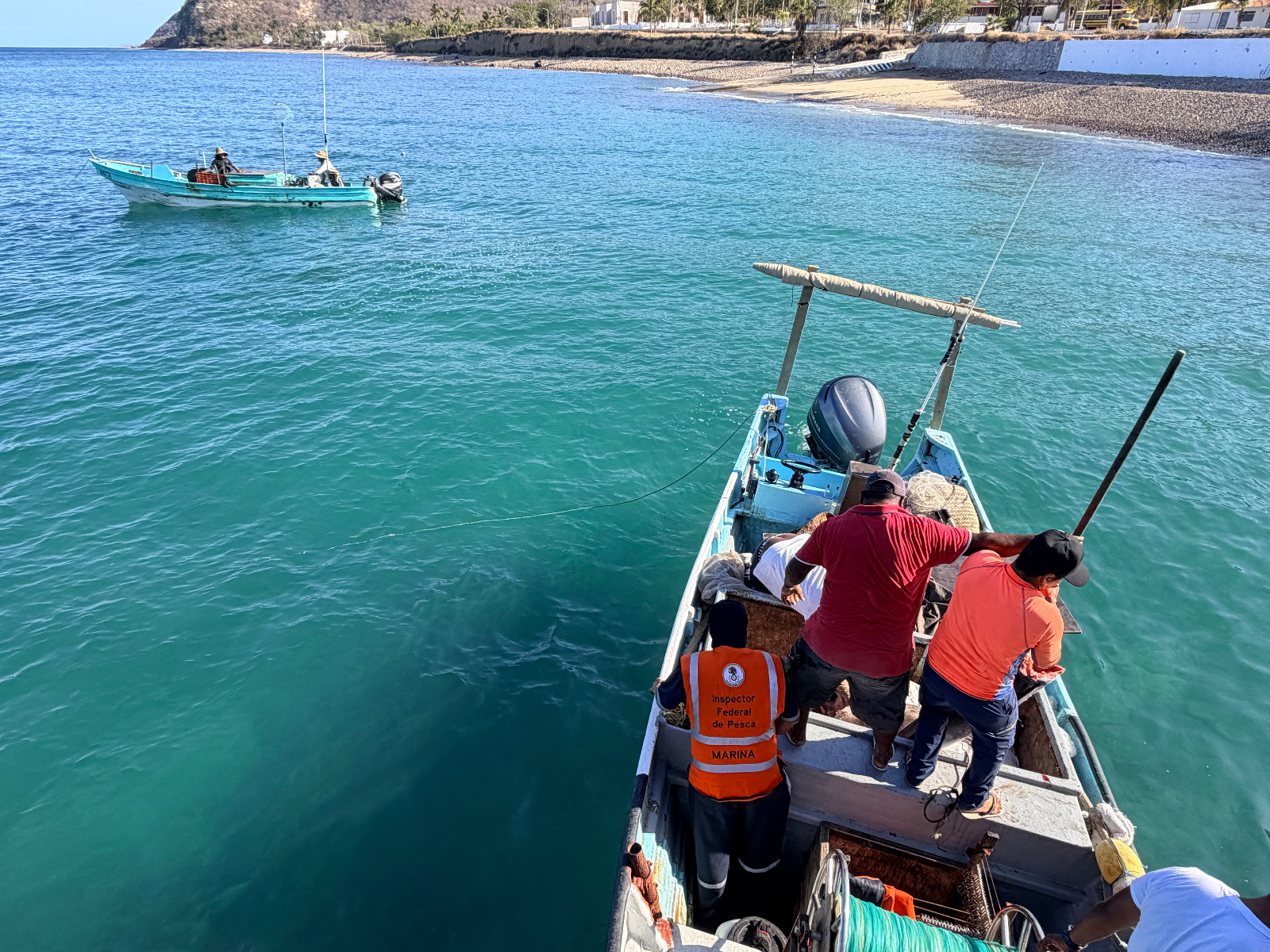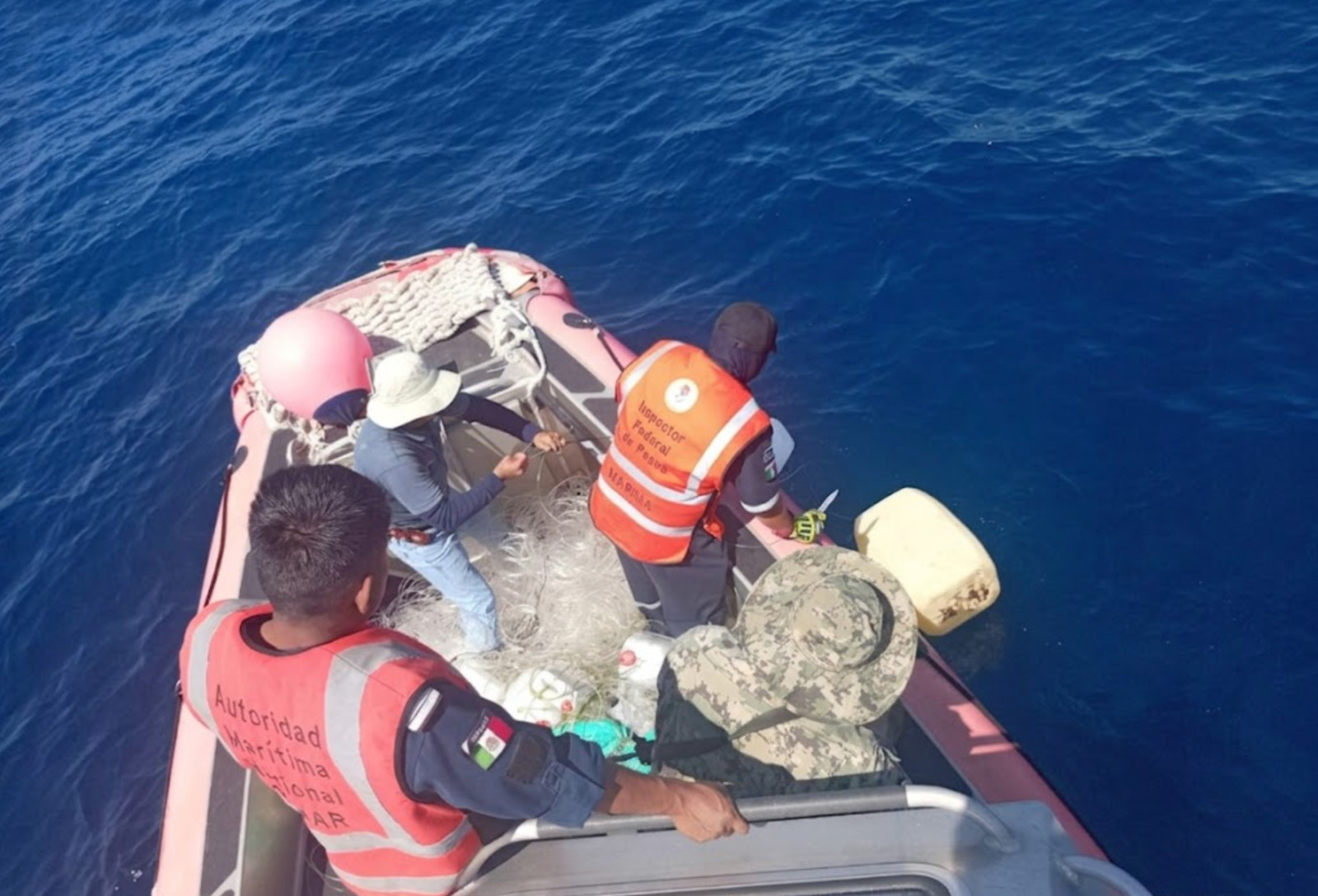 En una primera acción, durante recorridos de patrullaje y vigilancia marítima, personal naval y de Conapesca a bordo de una embarcación tipo Defender perteneciente a este Mando Naval, detectaron boyas improvisadas que formaban parte de un arte de pesca tipo “cimbra” o “palangre”, la cual estaba abandonada en el mar, por lo que se procedió a su levantamiento. Citada arte de pesca medía aproximadamente tres kilómetros de longitud y contaba con alrededor de 100 anzuelos de acero inoxidable.
