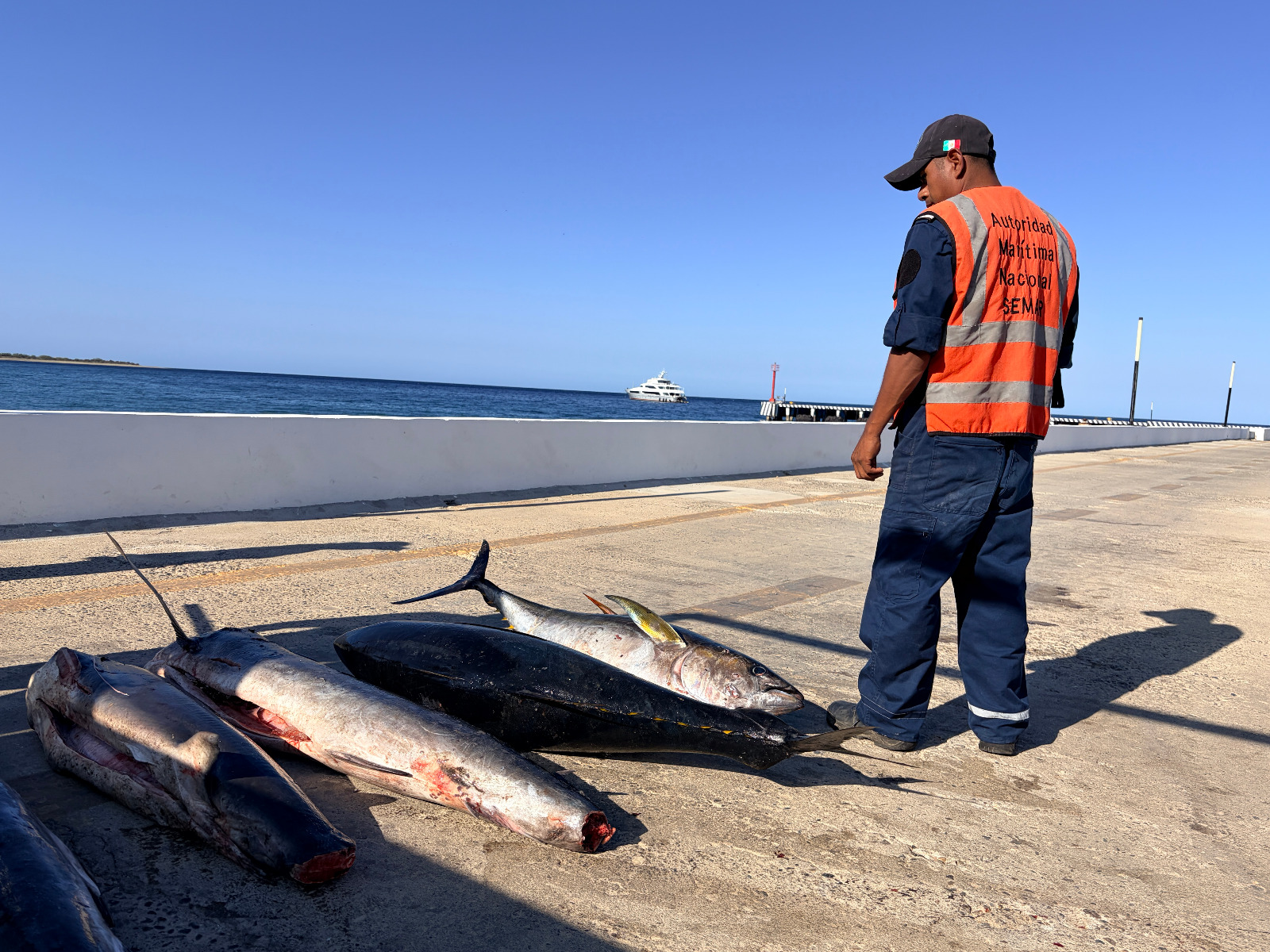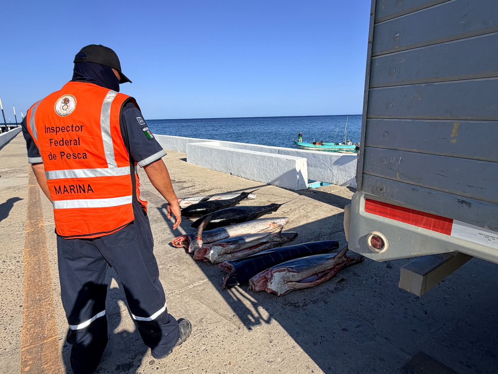 En una segunda acción, se interceptó a la embarcación menor de nombre “YAREMAR”, la cual operaba sin matrícula, con producto pesquero a bordo (consistente en seis tiburones, tres atunes y tres marlínes). Debido a que los tripulantes no pudieron acreditar su legal procedencia, la unidad fue conducida a Puerto Balleto para realizar la retención precautoria de citado producto.