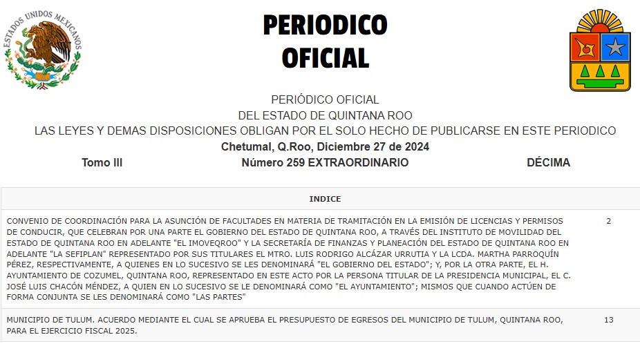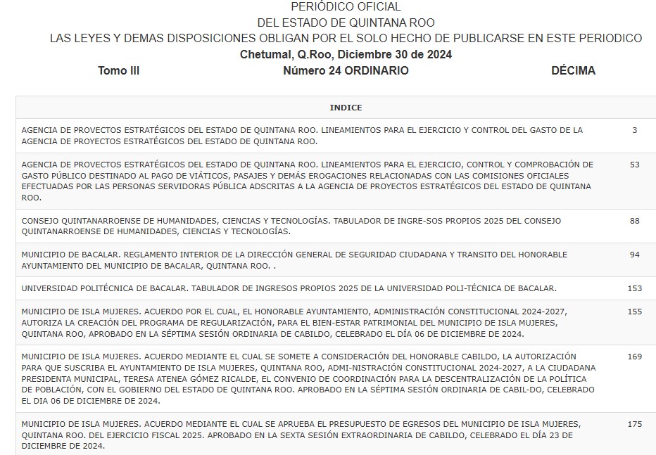 A la fecha, sólo los ayuntamientos de Tulum, Puerto Morelos e Isla Mujeres han cumplido con la obligación legal de publicar sus presupuestos de egresos para el 2025 en el Periódico Oficial del Estado.