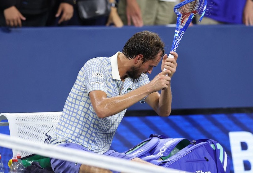 Al finalizar el partido y descompuesto tras la derrota, Medvedev destrozó su raqueta a golpes, sentado en su banco, sin salir de la pista.