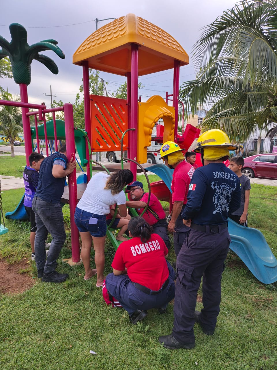 Chetumal, 21 de septiembre.- Un incidente ocurrido en un parque de la colonia Pacto Obrero en Chetumal movilizó a paramédicos y elementos del cuerpo de bomberos, luego de que una menor quedara atrapada en un juego infantil.