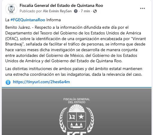 Respecto a la información difundida este día por el Departamento del Tesoro del Gobierno de los Estados Unidos de América (OFAC), sobre ala identificación de una organización encabezada por “Vinrant Bhardwaj”, señalada de facilitar el tráfico de personas, se informa que desde hace varios meses dicha investigación se desarrolla de manera conjunta entre autoridades del Gobierno de México, del Gobierno de los Estados Unidos de América y del Gobierno del Estado de Quintana Roo.