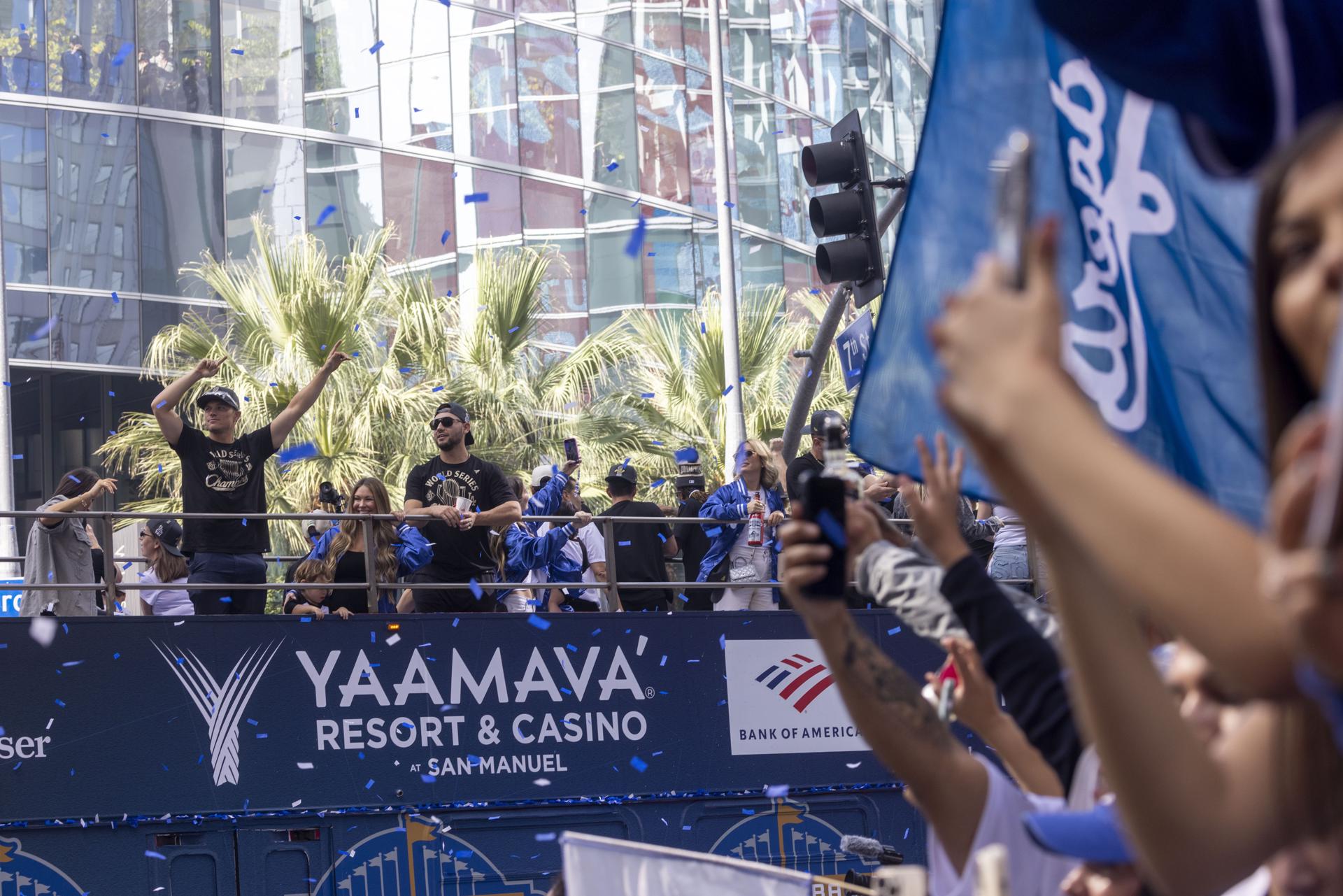 Una lluvia de confeti azul envolvió una caravana de autobuses descapotables que transportaban a los jugadores en un lento recorrido por el centro de Los Ángeles, dos días después de su épica victoria en la Serie Mundial contra los Azulejos de Toronto.