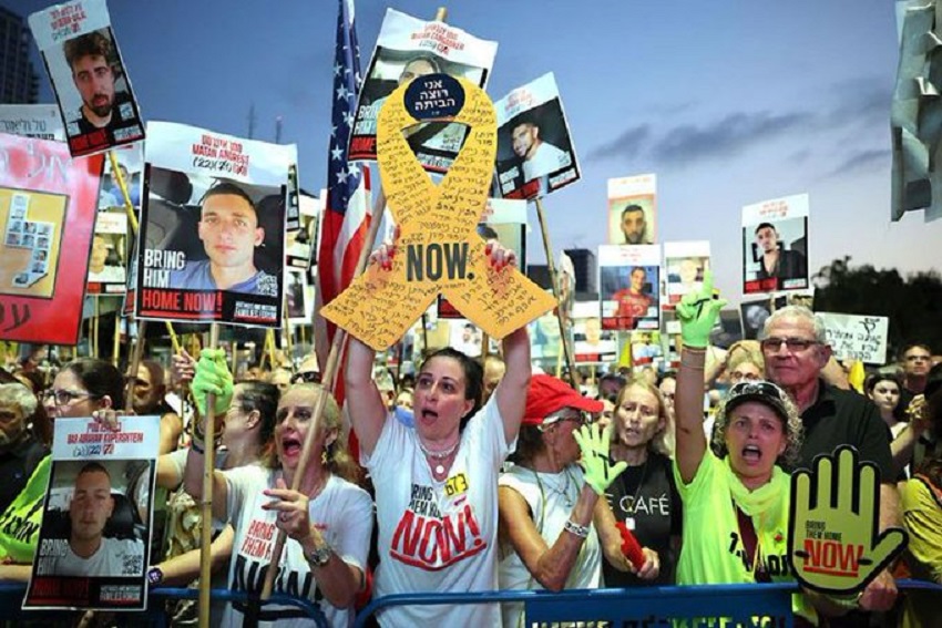 Decenas de miles de israelíes salieron este sábado (09.08.2025) a las calles de Tel Aviv para protestar por la decisión del Gobierno de Israel de expandir su ofensiva en la Franja de Gaza y para pedir un acuerdo de alto al fuego y liberación de rehenes con el grupo islamista Hamás, considerado terrorista por Estados Unidos y la Unión Europea y que lanzó una ofensiva contra territorio israelí el 7 de octubre de 2023.