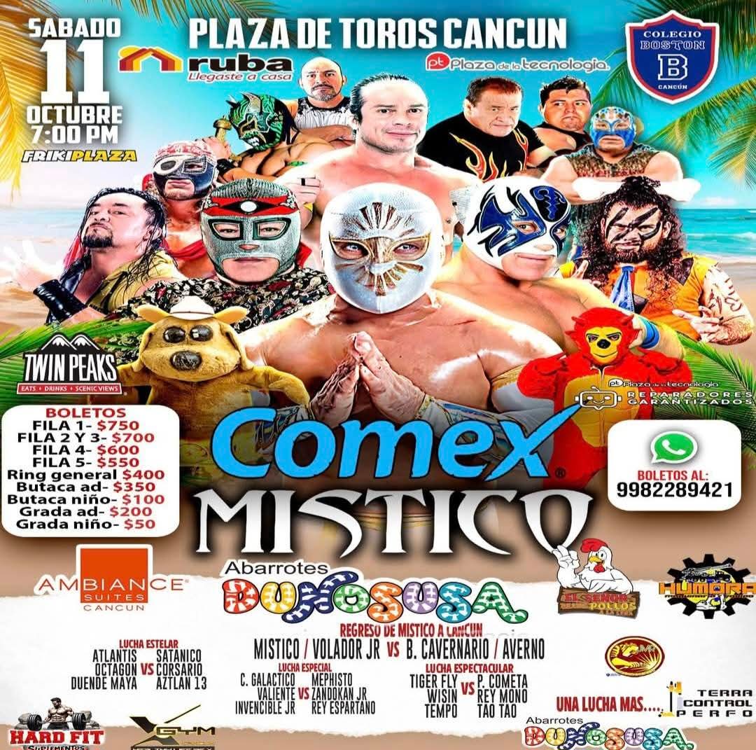 CANCÚN, Q. ROO a 23 de septiembre.- Tras casi dos años de ausencia en el -Caribe Mexicano-, el próximo sábado 11 de octubre en punto de las 19:00 horas, el luchador mexicano más famoso en la actualidad como lo es Místico, estará encabezando un cartel luchístico en la Plaza de Toros Cancún, en el que han sido inmiscuidas varias figuras actuales, así como de otras legendarias del Consejo Mundial de Lucha Libre (CMLL), además de lo mejor de la baraja local.