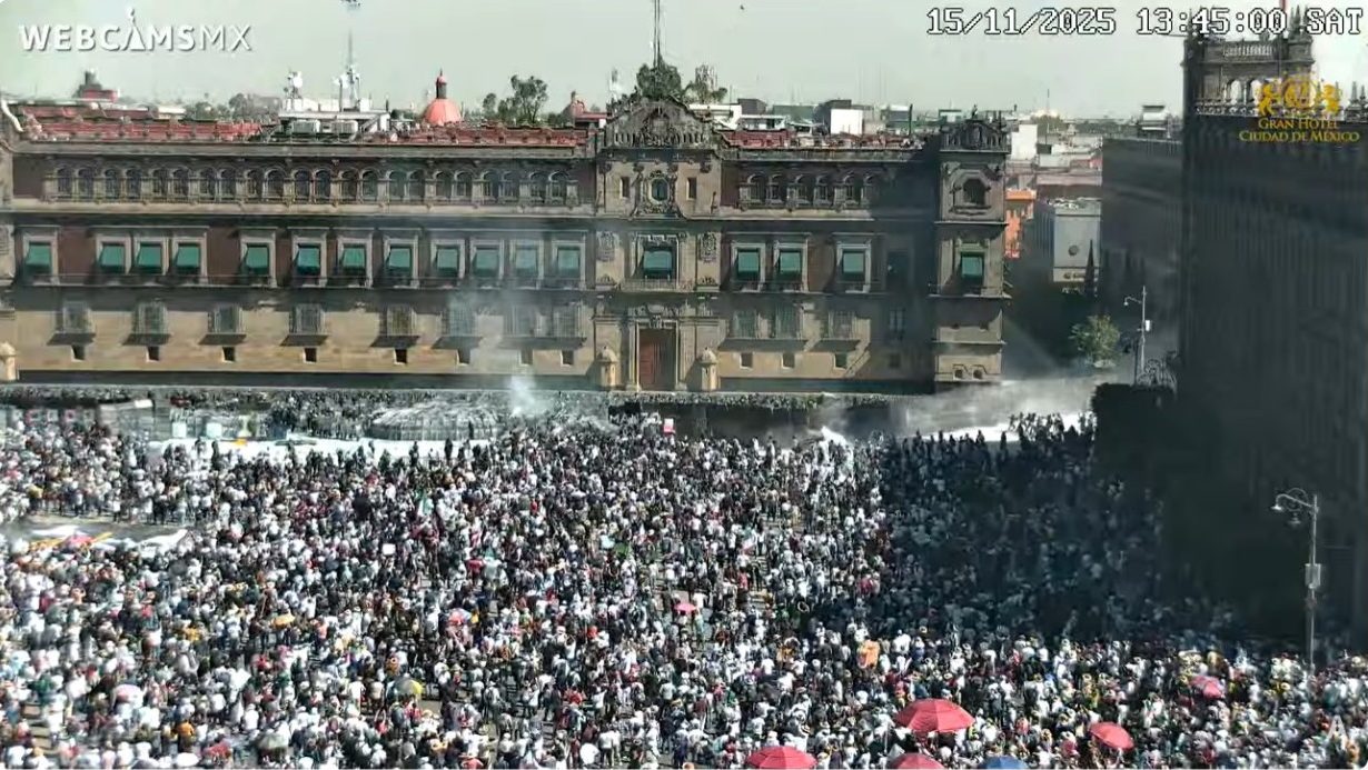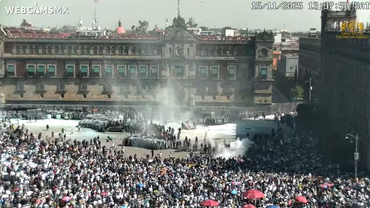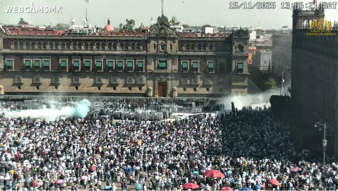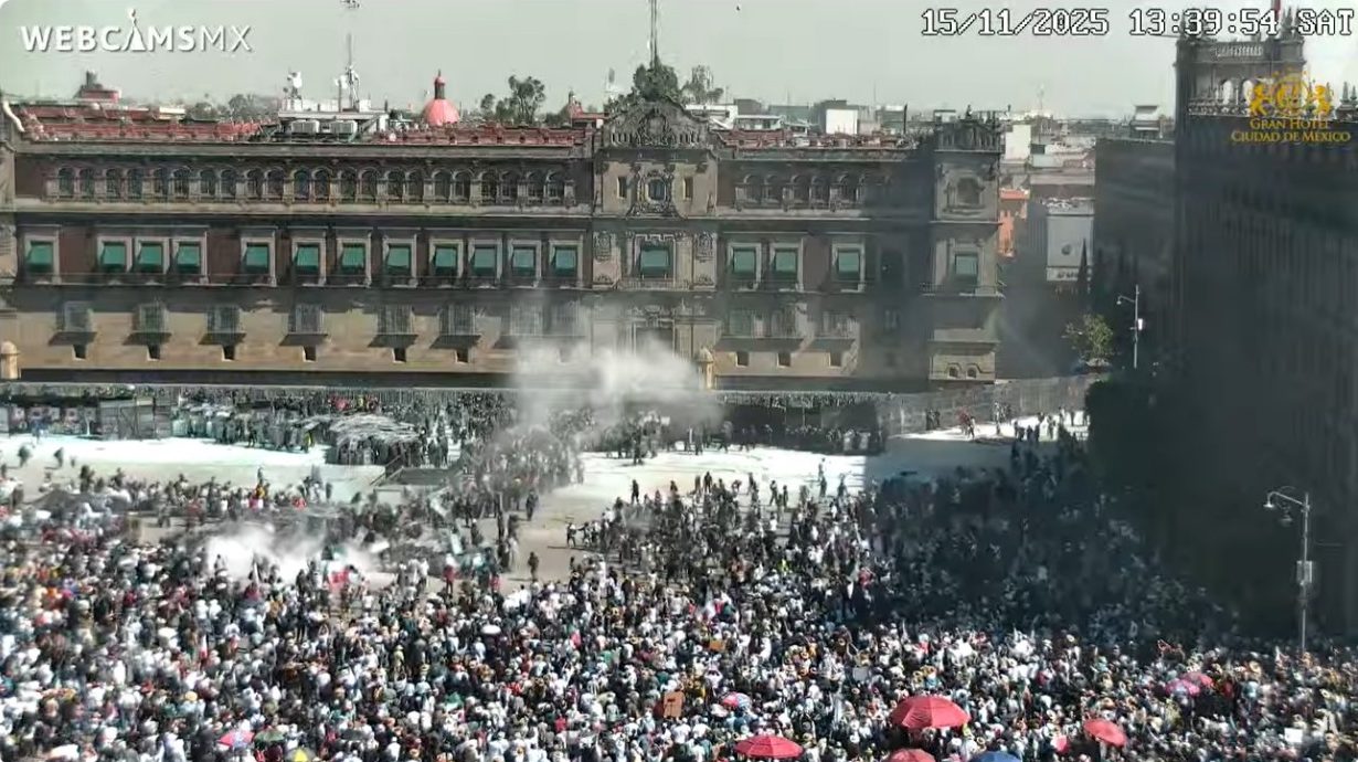 CIUDAD DE MÉXICO, 15 de noviembre.- A través de una cámara de visión panorámica del sistema Webcams de México, los mexicanos y el mundo pudieron observar en vivo las imágenes de la confrontación entre manisfestantes de la Generación Z y del Movimiento del Sombrero y policías de la Ciudad de México frente al Palacio Nacional, en el zócalo de la capital de la República.