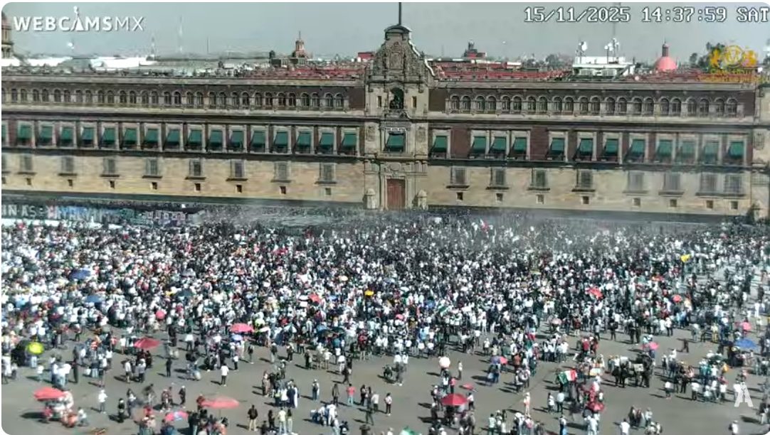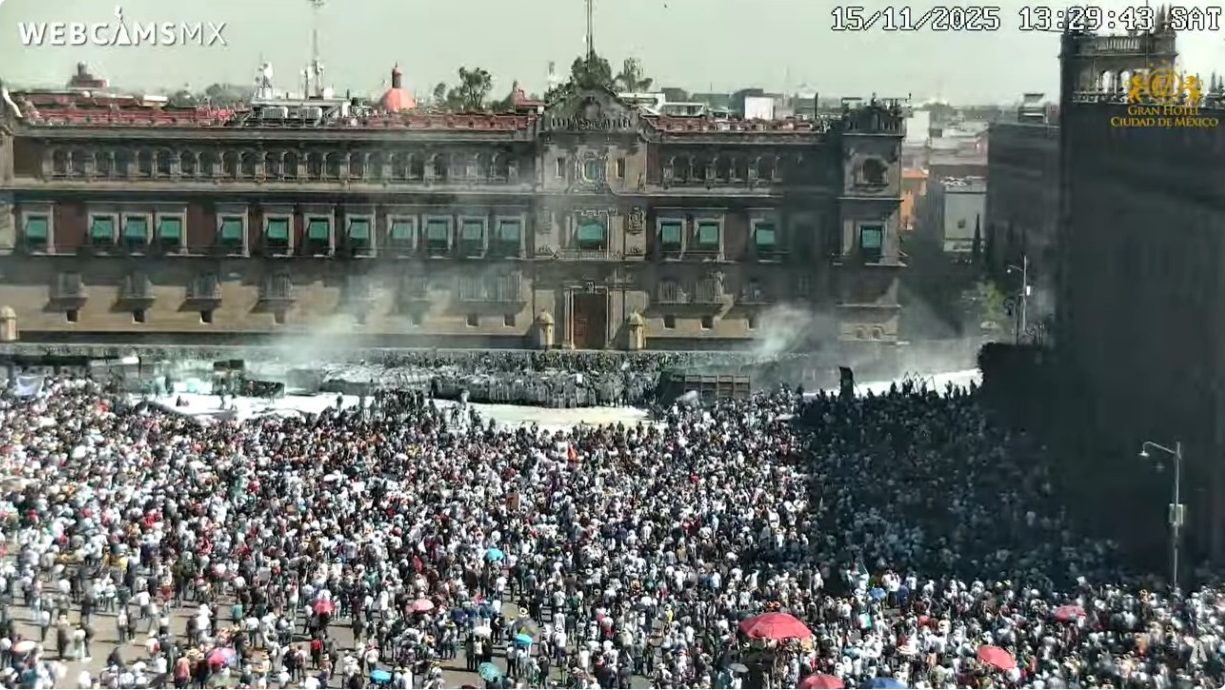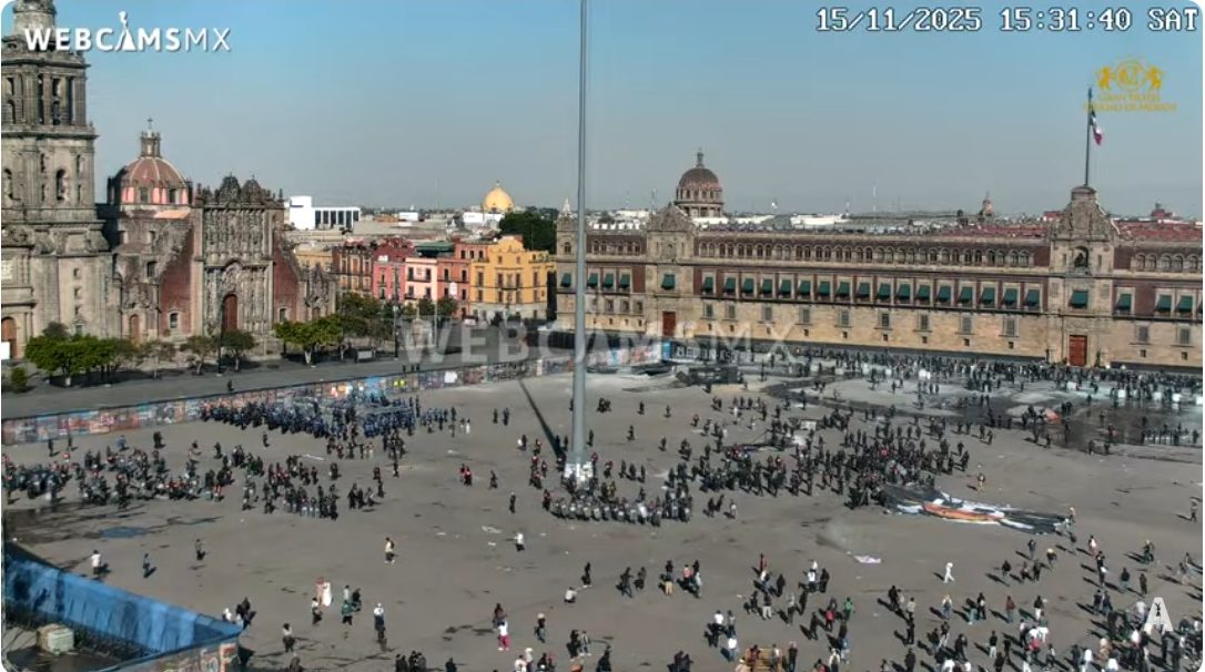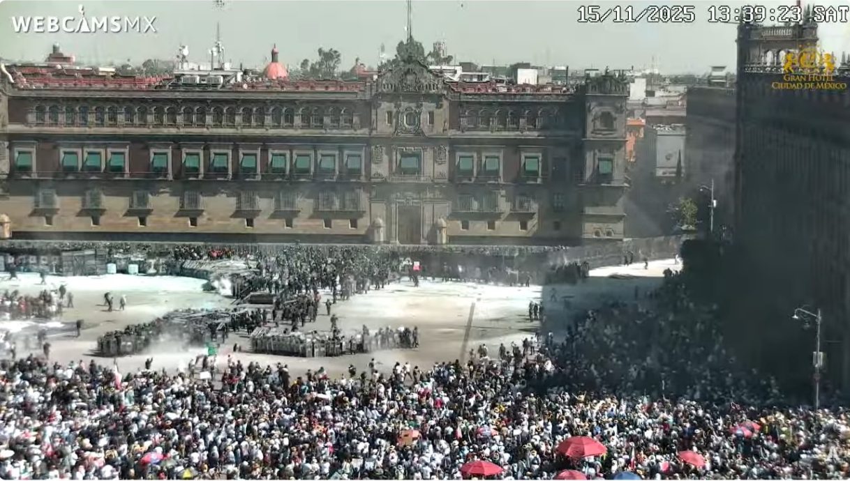 CIUDAD DE MÉXICO, 15 de noviembre.- A través de una cámara de visión panorámica del sistema Webcams de México, los mexicanos y el mundo pudieron observar en vivo las imágenes de la confrontación entre manisfestantes de la Generación Z y del Movimiento del Sombrero y policías de la Ciudad de México frente al Palacio Nacional, en el zócalo de la capital de la República.