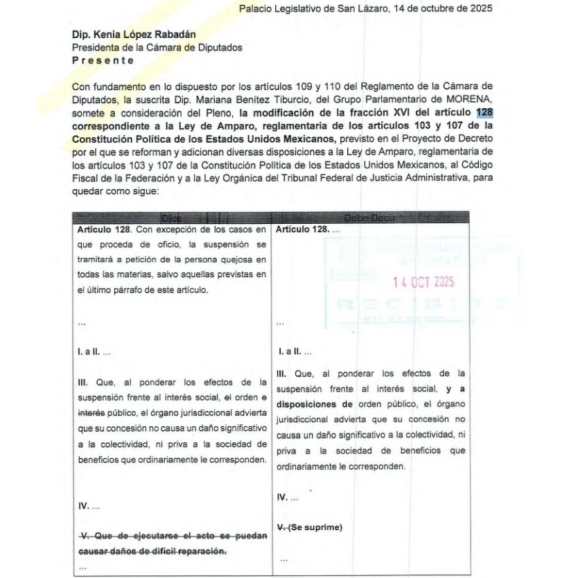 Además, dijo que se plantea eliminar la fracción V que señala “que de ejecutarse el acto se puedan causar daños de difícil reparación”, ya que dicho requisito, además de ambiguo, es incompatible con el texto constitucional y con los principios de progresividad en materia de derechos humanos.