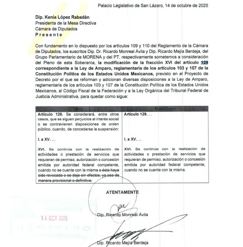 También se aceptó la reserva de los diputados Ricardo Monreal Ávila, de Morena, y Ricardo Sóstenes Mejía Berdeja, del PT, para modificar la fracción XVI del artículo 129 de la Ley de Amparo, sobre los casos en que está prohibido otorgar las suspensiones, para que diga: “Se continúe con la realización de actividades o prestación de servicios que requieran de permiso, autorización o concesión emitida por autoridad federal competente, cuando no se cuente con la misma”.