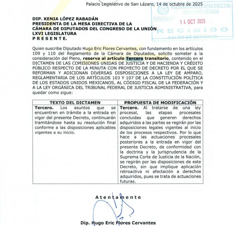 Flores Cervantes comentó que esta reserva la presenta a nombre de las y los diputados de su grupo parlamentario, y que la misma fue comentada por la presidenta de la República, Claudia Sheinbaum Pardo, y consensuada por su coordinador parlamentario, diputado Ricardo Monreal Ávila, por lo que la nueva redacción del transitorio es un tema de derecho procesal que deriva de una disposición constitucional, en el artículo 14.